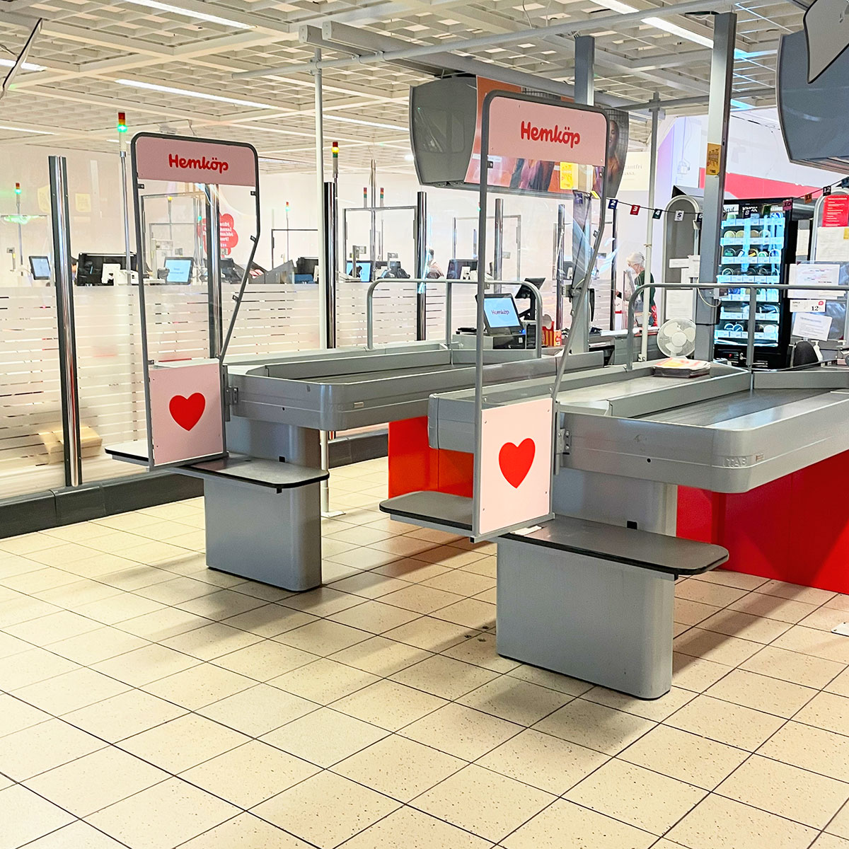 - スーパーマーケットでレジを通した後に流れてくるレーンの間には、
