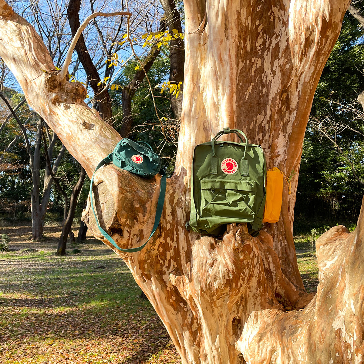 リュックの脇の黄色い縦長ポーチは、ボトルホルダーで、