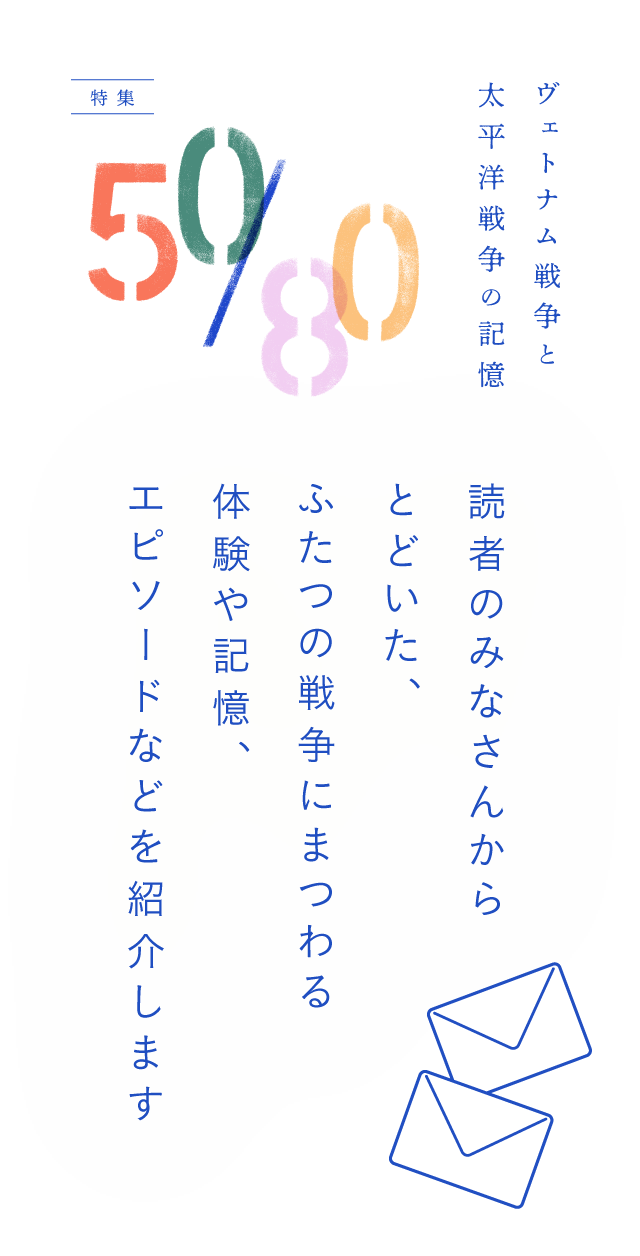 2025-12-04-THU 2025-11-30-SUN 2025-11-29-SAT 2025-11-26-WED 2025-11-22-SAT 2025-11-19-WED 2025-11-18-TUE 2025-11-17-MON 2025-11-16-SUN 2025-11-15-SAT 2025-11-14-FRI 2025-11-13-THU 2025-11-12-WED 2025-11-11-TUE 2025-11-10-MON 2025-11-09-SUN 2025-11-08-SAT 2025-11-07-FRI 2025-11-06-THU 2025-11-05-WED 2025-11-04-TUE 2025-11-03-MON 2025-11-02-SUN 2025-11-01-SAT 2025-10-31-FRI 2025-10-30-THU 2025-10-29-WED 2025-10-28-TUE 2025-10-27-MON 2025-10-26-SUN 2025-10-25-SAT 2025-10-24-FRI 2025-10-23-THU 2025-10-22-WED 2025-10-21-TUE 2025-10-20-MON 2025-10-19-SUN 2025-10-18-SAT 2025-10-17-FRI 2025-10-16-THU 2025-10-15-WED 2025-10-14-TUE 2025-10-13-MON 2025-10-12-SUN 2025-10-11-SAT 2025-10-10-FRI 2025-10-09-THU 2025-10-08-WED 2025-10-07-TUE 2025-10-06-MON 2025-10-05-SUN 2025-10-04-SAT 2025-10-03-FRI 2025-10-02-THU 2025-10-01-WED 2025-09-30-TUE 2025-09-29-MON 2025-09-28-SUN 2025-09-27-SAT 2025-09-26-FRI 2025-09-25-THU 2025-09-24-WED 2025-09-23-TUE 2025-09-22-MON 2025-09-21-SUN 2025-09-20-SAT 2025-09-19-FRI 2025-09-18-THU 2025-09-17-WED 2025-09-16-TUE 2025-09-15-MON 2025-09-14-SUN 2025-09-13-SAT 2025-09-12-FRI 2025-09-11-THU 2025-09-10-WED 2025-09-09-TUE 2025-09-08-MON 2025-09-07-SUN 2025-09-06-SAT 2025-09-05-FRI 2025-09-04-THU 2025-09-03-WED 2025-09-02-TUE 2025-09-01-MON 2025-08-31-SUN 2025-08-30-SAT 2025-08-29-FRI 2025-08-28-THU 2025-08-27-WED 2025-08-26-TUE 2025-08-25-MON 2025-08-24-SUN 2025-08-23-SAT 2025-08-22-FRI 2025-08-21-THU 2025-08-20-WED 2025-08-19-TUE 2025-08-18-MON 2025-08-17-SUN 2025-08-16-SAT 2025-08-15-FRI 2025-08-14-THU 2025-08-13-WED 2025-08-12-TUE 2025-08-11-MON ヴェトナム戦争/太平洋戦争にまつわる 読者のみなさんからのお便りを募集いたします。 ご自身の戦争体験はもちろん、 おじいちゃんやおばあちゃんなどご家族や ご友人・知人の方、 地域のご老人などから聞いた戦争のエピソード、 感銘を受けた戦争映画や小説についてなど、 テーマや話題は何でもけっこうです。 いただいたお便りにはかならず目を通し、 その中から、 「50/80 ヴェトナム戦争と太平洋戦争の記憶」 の特集のなかで、 少しずつ紹介させていただこうと思います。