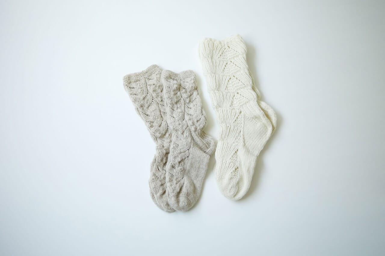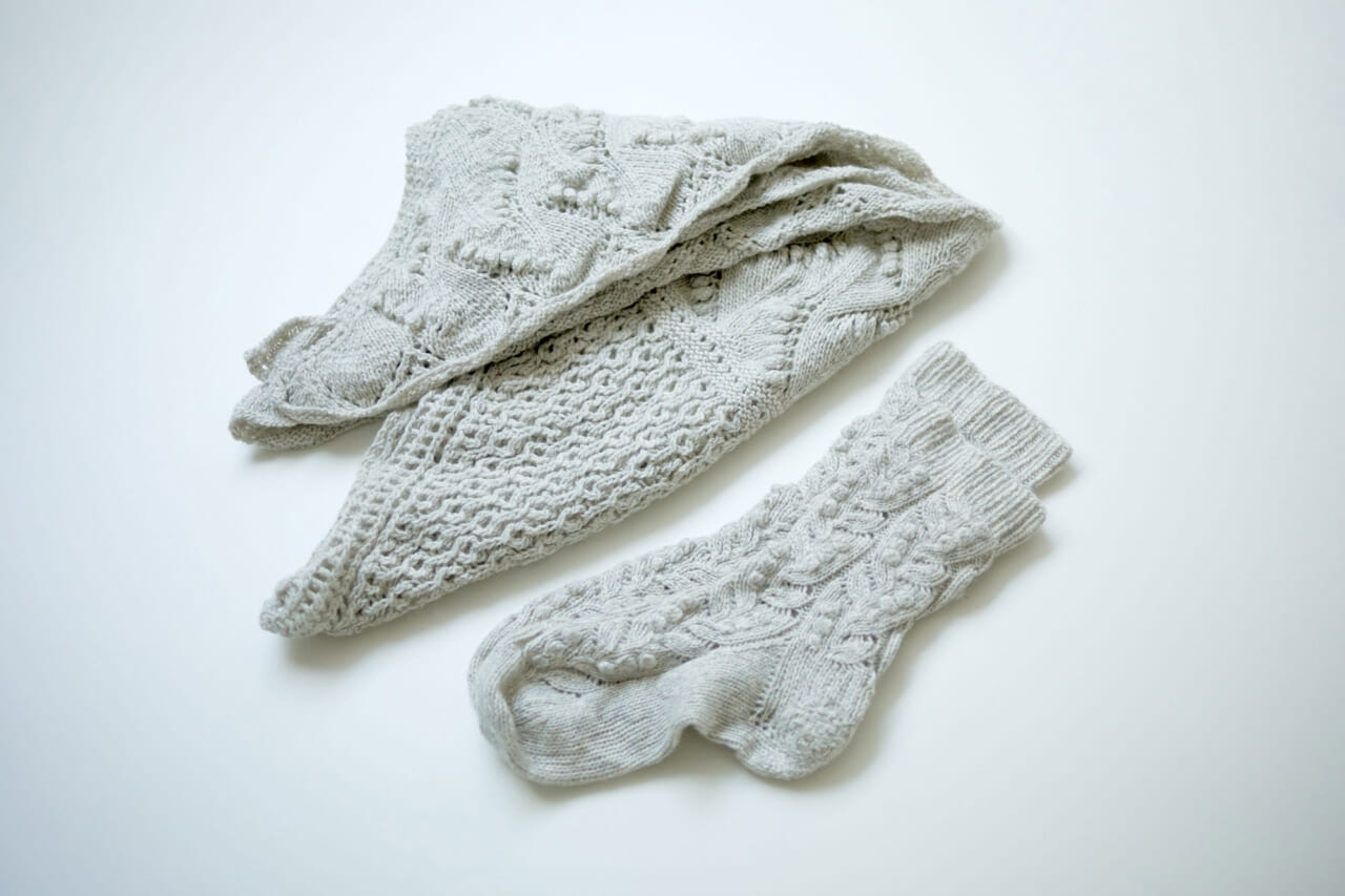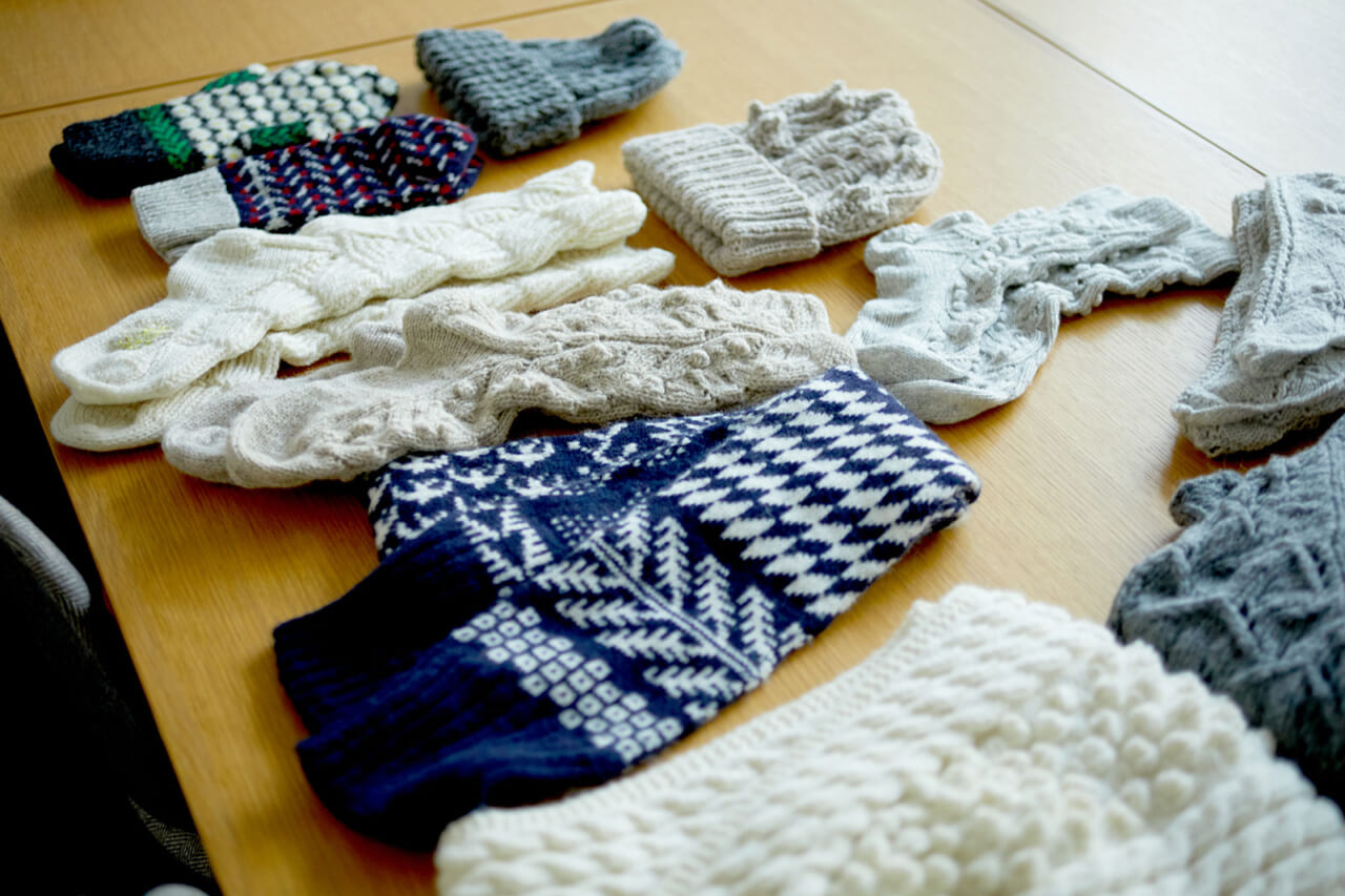 合間に靴下や手袋など小物を編んでいる牧野さん。