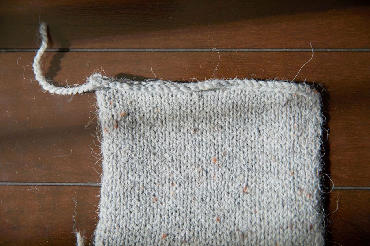 カウチンの技法で、裏の渡り糸を編みくるんでいるので