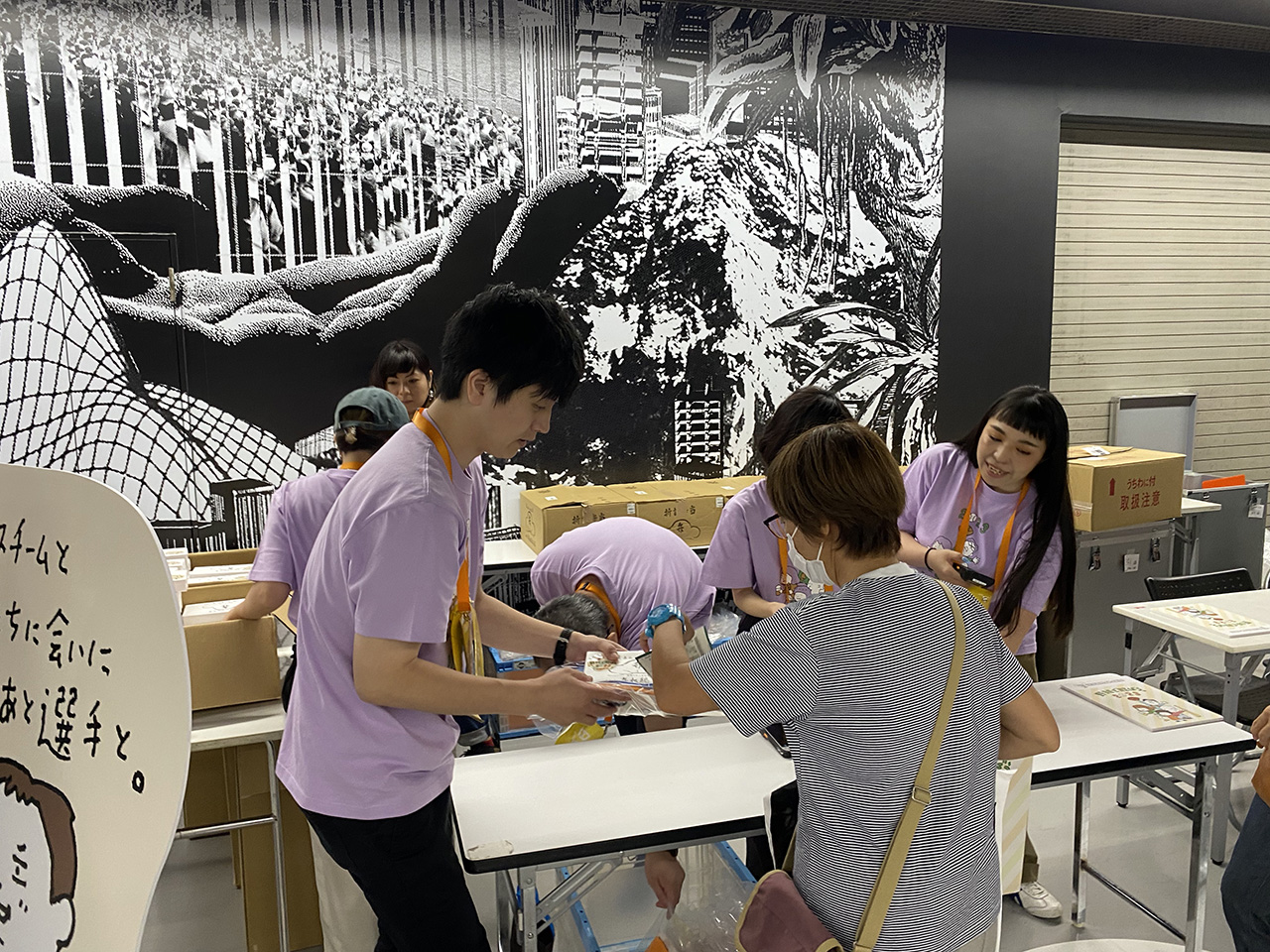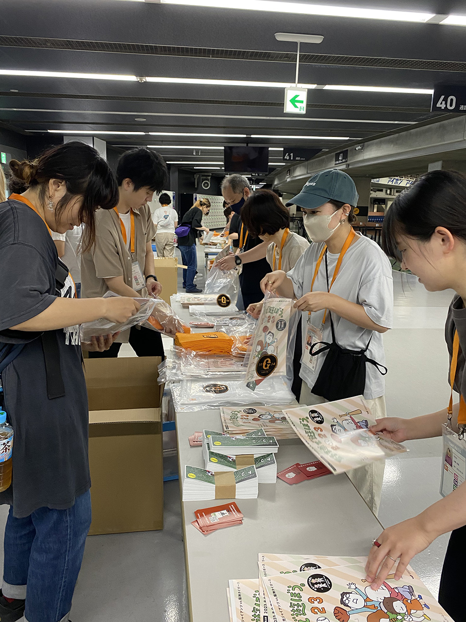 特製パンフレットやジャイアンツのタオルを袋詰します。