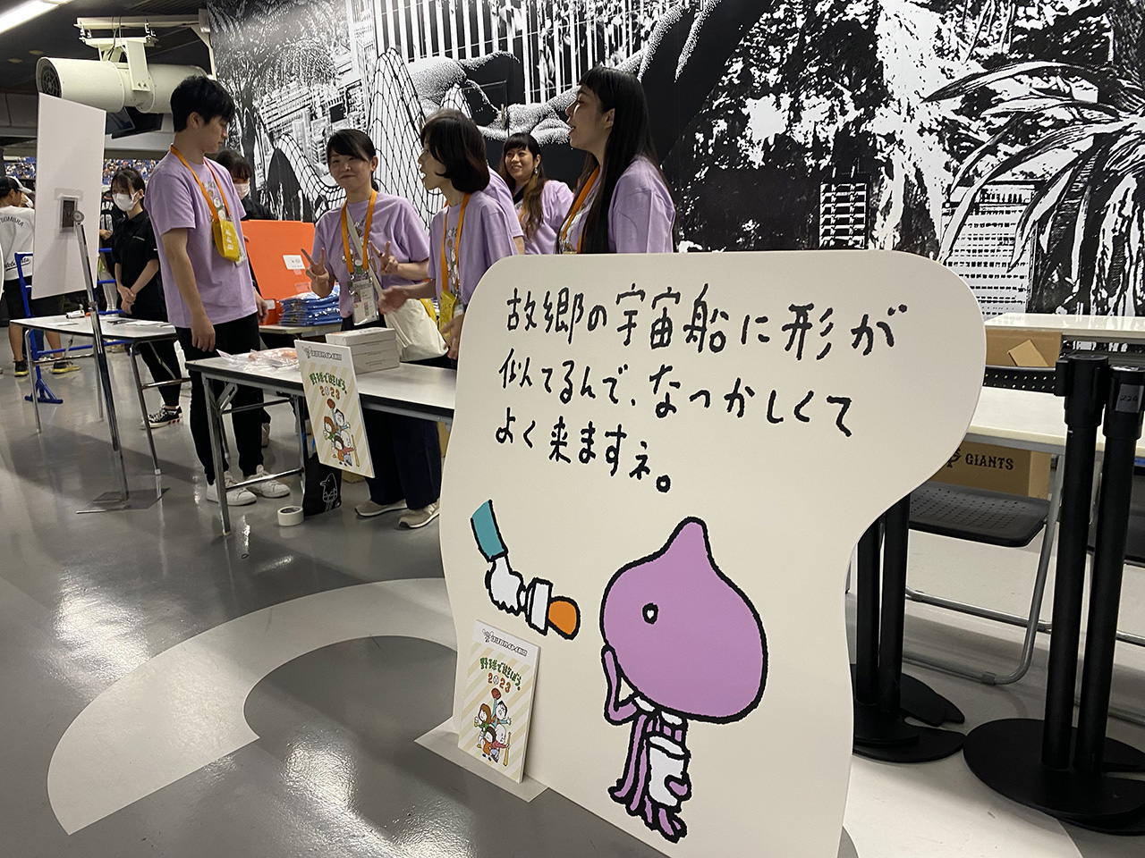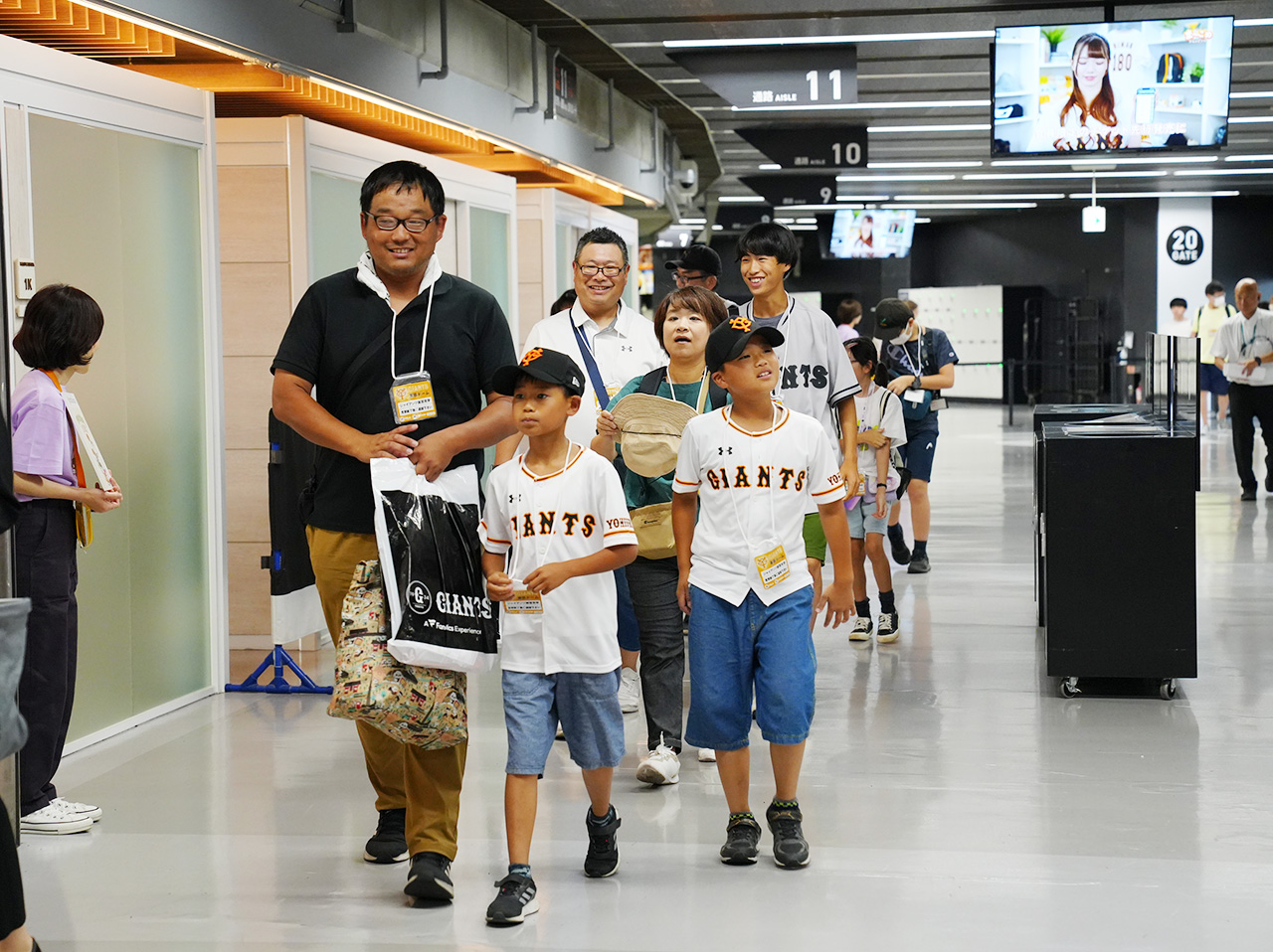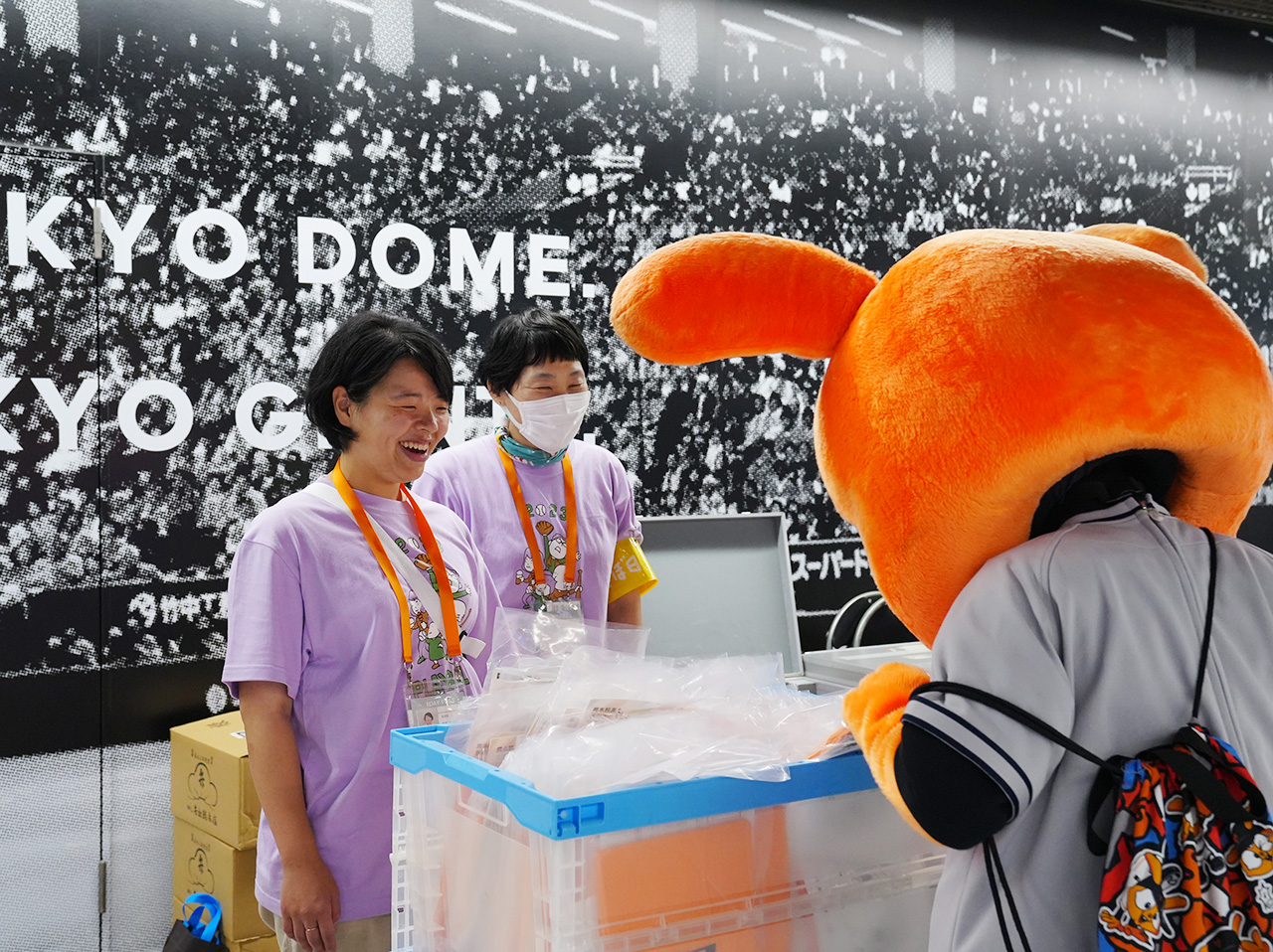 - ▲一塁側(巨人側)入口の配布物をチェックしにきた