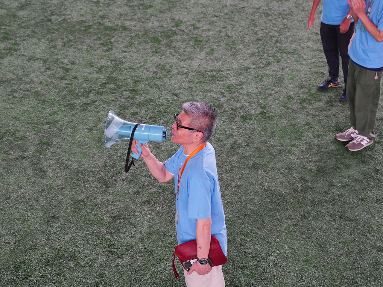 試合前にみんなでリハーサル。高い脚立の上に座る
