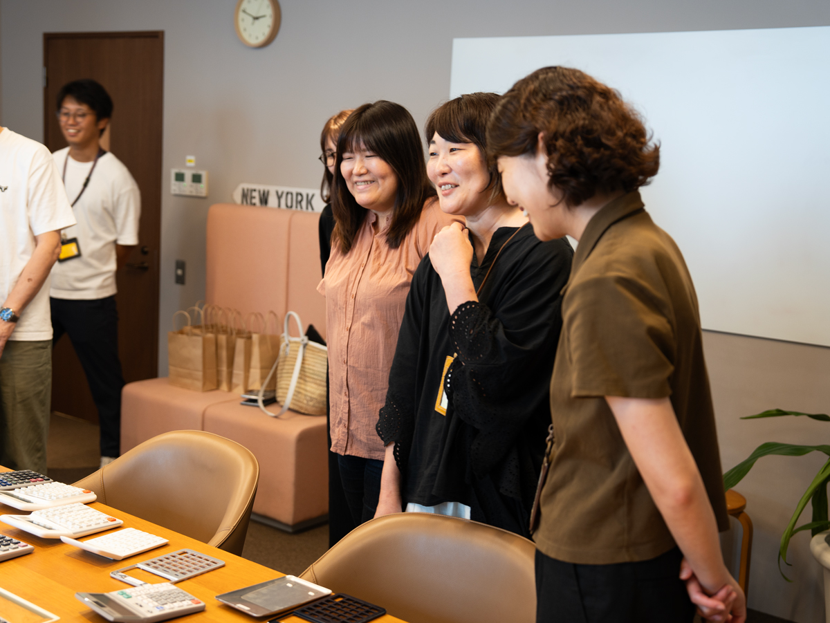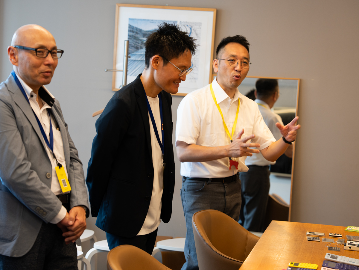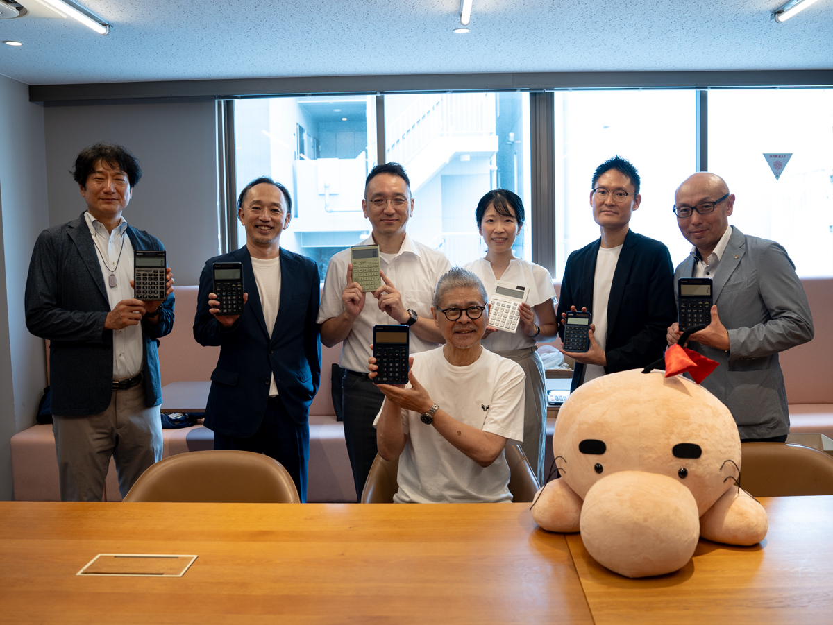 ▲乗組員・和田の電卓をほほえましく眺める、カシオ計算機のみなさん。