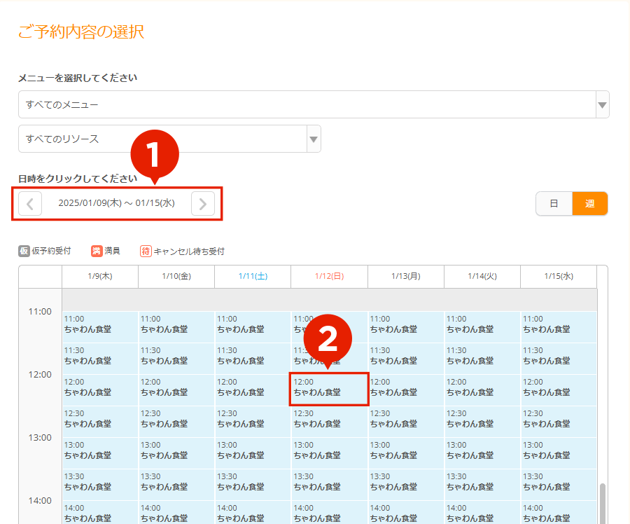 図のようなカレンダーが表示されます。①ちゃわん食堂の開催期間(1/9~1/15)に