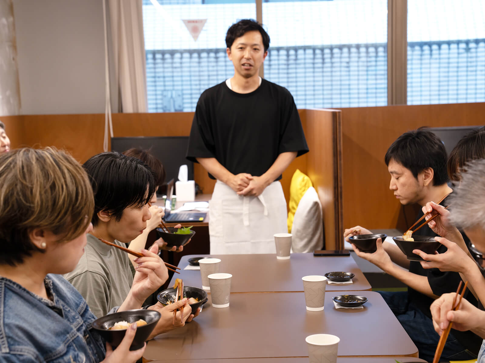▲斉吉の啓志郎さんと、試食するほぼ日メンバー。おいしいものを食べて真顔。そのときの一番おいしい魚を食べてもらいたい、と、