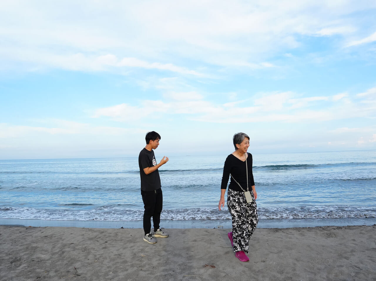 ▲能登の海岸にいる斉吉の和枝さんと啓志郎さん能登も海の幸の宝庫です。