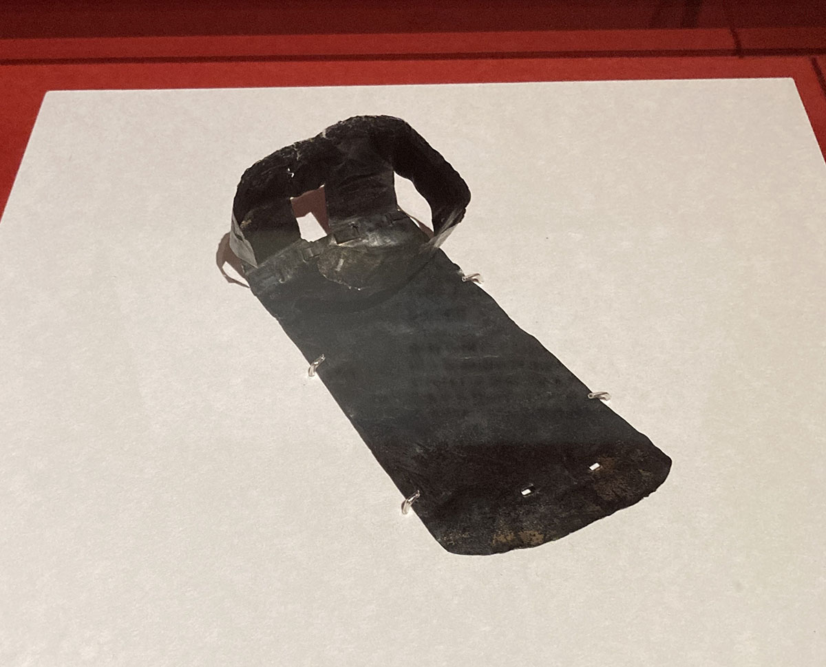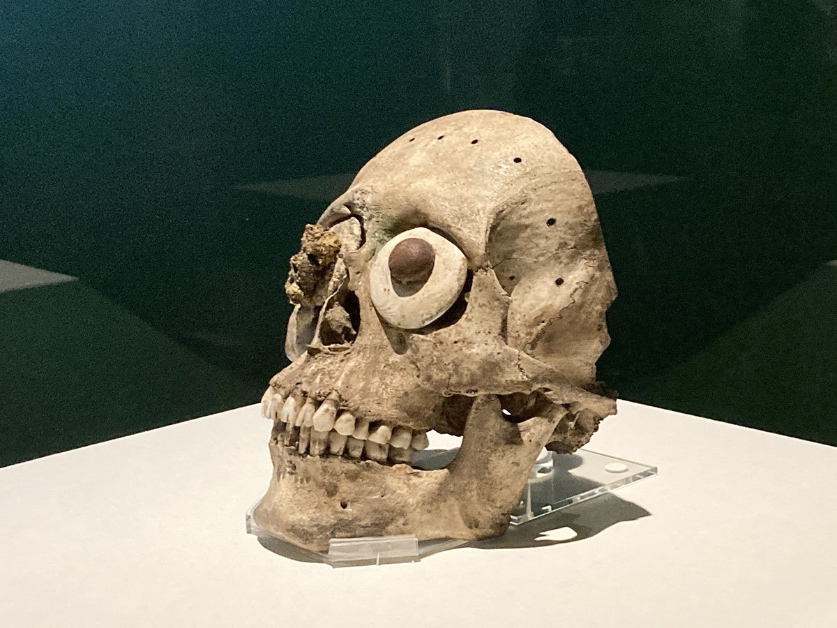 目には貝殻と黄鉄鉱(金色)をはめ込まれ、