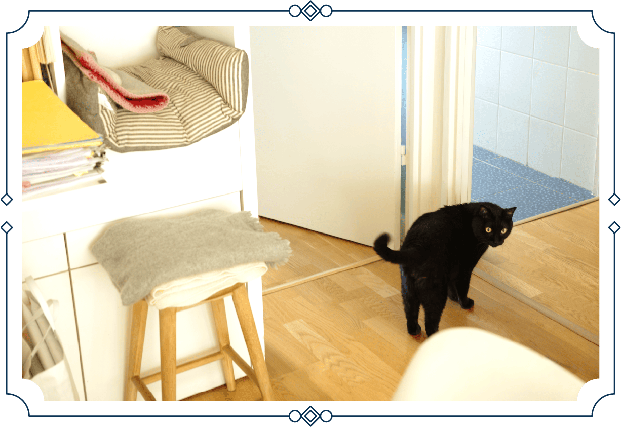 アパルトマンの玄関中に猫砂が散って。