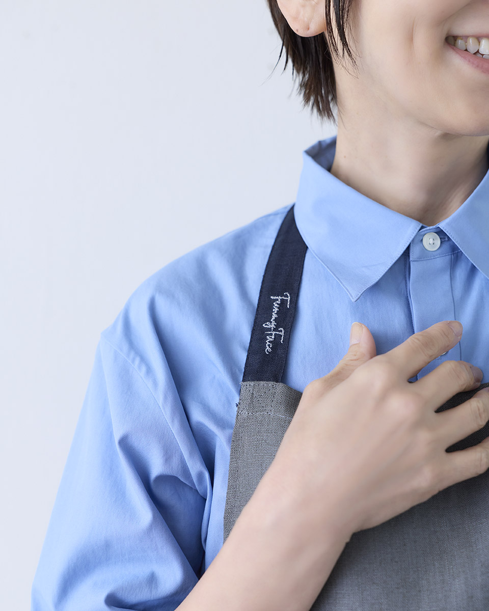 緑のトップスに「POWDER BLOOM」のエプロンは、