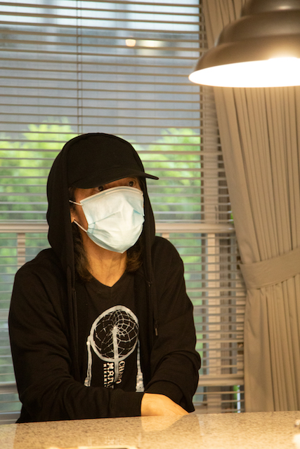 仲井戸さんは、マスクにフードの「コロナファッション」。