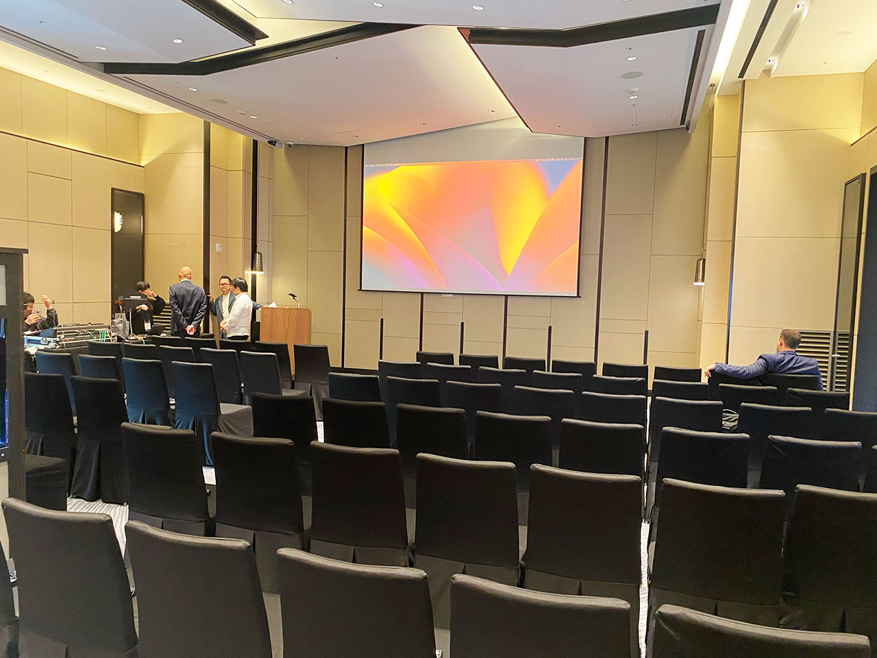 会場の席が埋まりはじめました。 - スーツの人もいれば、カジュアルな人もいますが、