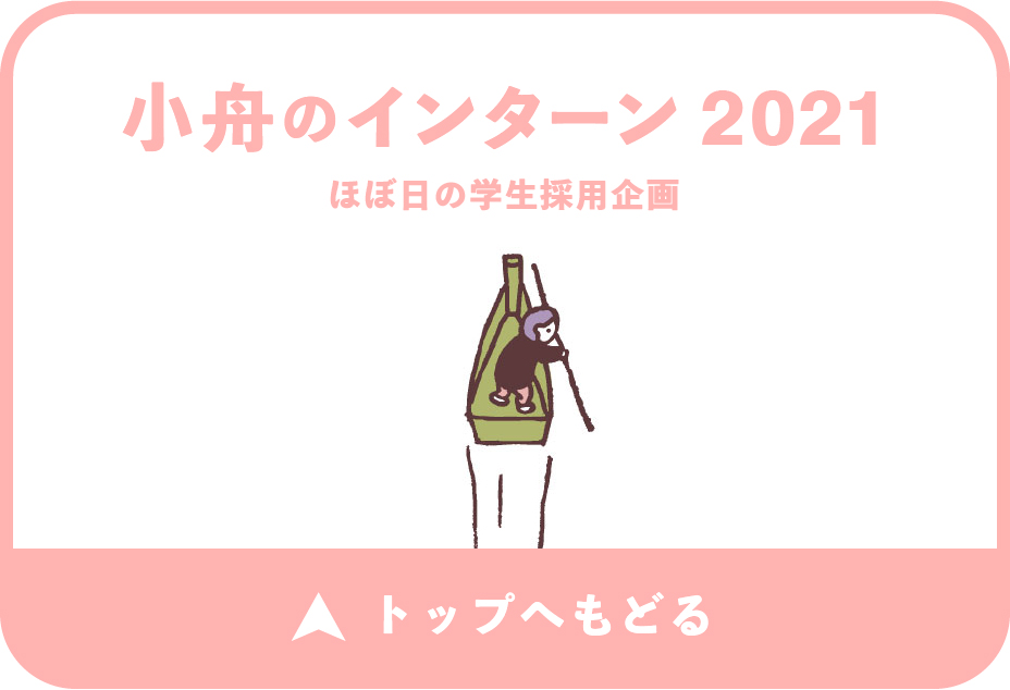 ほぼ日では、どんな人たちがはたらいているのだろう。インターン生がインタビューしました。 ひとりひとりが自立しながら、 集合している会社。 2021-02-09-TUE ルーティンを嫌う会社、 自分たちで考える会社。 2021-02-09-TUE わからないことを 素直にわからないって いう大人たち。 2021-02-09-TUE ほんとに、つらくて、 だけど、楽しい。 2021-02-09-TUE チャンスや機会に出会える場所。 2021-02-09-TUE 取れるボールは取りに行こう。 2021-02-09-TUE 本当の意味で、 デザインするとこが いっぱいあるから。 2021-02-09-TUE 自由と責任がある会社。 2021-02-09-TUE 自分の立ち位置が不思議というか、 新鮮だなぁと思っているところ。 2021-02-09-TUE こっちが本気なら、 何でも応援してくれるし、 惜しみなく手伝ってくれる。 2021-02-09-TUE ここは、さなぎの中のような場所 2021-02-09-TUE 選択肢はいっぱいある。 2021-02-09-TUE