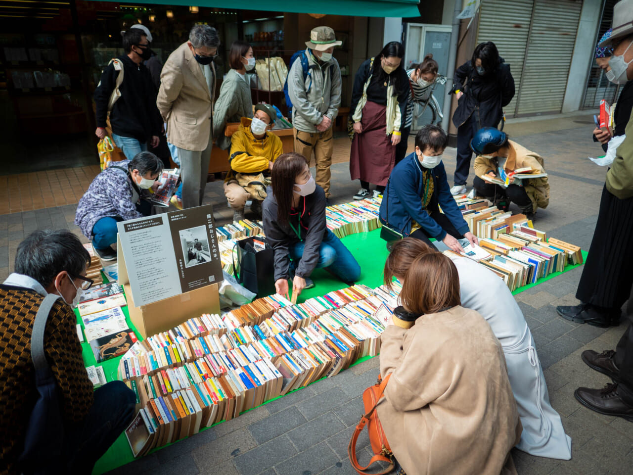 その本をたくさんの人がしゃがみこんで読んでいる。