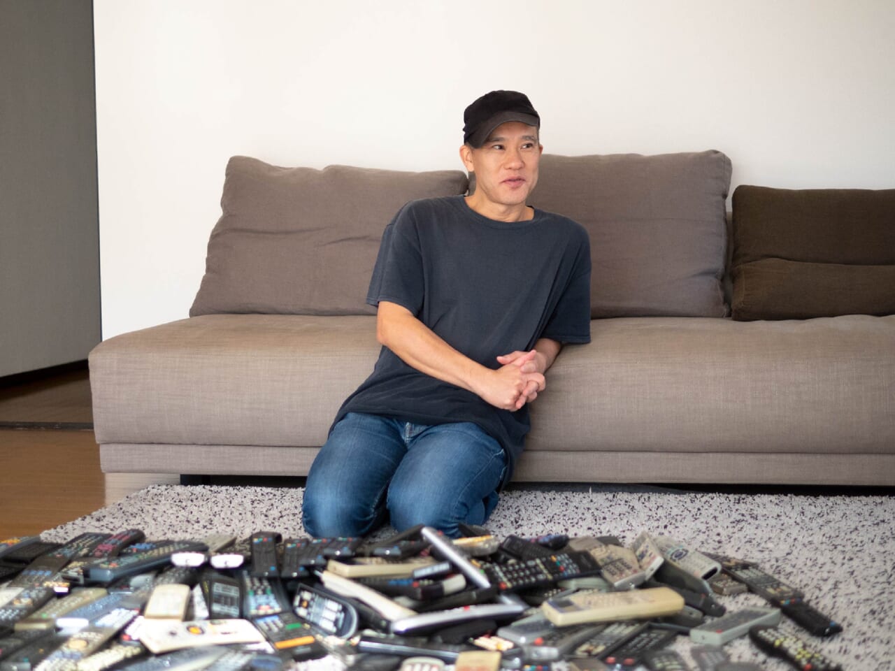 初回から「最近」じゃないんだけど、すいません。もう20年以上前から集めてます。まだ西海岸にいたころ‥‥あ、ぼくサンフランシスコにいたんですけど、当時1個99セントとかで売ってたんです。ジャンク屋で。それをアメリカ人のおっさんたちが超真剣に見てるんですよ。品定めで。へぇ~と思って。で、ぼくも何となく集めはじめたんですけど‥‥あるとき100個まとめて出てたんです。メルカリに。それで一気に増えました。3000円とかだったかなあ。だから1個30円とか、そういう世界。まだ使えるものもあると思いますよ。使いようもないけど。これとかアクオスのやつですよね、テレビの。何だこれ「JUMBO」って(笑)。無闇にデカイから、わざわざ書いたのかな。いやあ、でも久しぶりに見ました。棚の奥のほうにしまってあったんで。え、何でこんなに買ったのかって? それいまさら聞きます? 何でだろう‥‥こんなにたくさんリモコンあったらどうかなと思って。リビングに。家族とかと「リモコン取って」「どれよ?」つって。「シルバーのやつ」「だからどれよ?」って(笑)。あとは、安かったから。100個で10万円ですなんて言われても買わないでしょ。まあ、3000円としても「いい晩メシ食えるじゃん」とかね、わかりますよ。でも「3000円」出して「100個のリモコン」を買う行為が、自分のなかではパフォーマンスに近かったのかな。誰も見てないのにね(笑)。え、じゃあ100個のリモコンが届いたとき、アーティストとしてどう感じたか‥‥って? 「重てぇ」ですかね。そりゃ重いよね。これだけあったら。テレビ、ビデオ、エアコン‥‥これとか何だ、レーザーディスクかな。よく見ると、人類の工夫のあとが刻み込まれてるんです。ボタン大きくしてみたり、ちっちゃくしてみたり。電源ボタンはだいたいついてるとか。はい? 価値ですか? ないですよ。お金的な価値は当然ゼロだし。かといって飾ってうれしいもんでもないし。価値のないものが好きなんですよ、そもそも。ん、まだまだ集める気かって? もういいかなと思ってます。ここから10個20個増えたところで、何も変わらないでしょ。1万個くらい一気に増えて、有栖川公園にリモコン敷き詰めるみたいなね、そういうクリストみたいなことができるんなら別ですけどね。そうじゃなければ、もう要らないです。とにかく、いまの数でも十分満足してるし、これだけリモコン集めてる人もいないと思うんで‥‥あ、メルカリに出してた人は、なんで100個も持ってたんだろう?