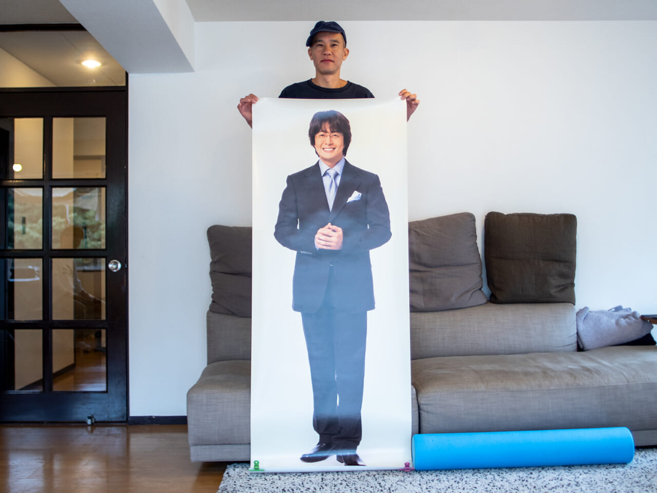 恵比寿をブラブラしてたら、向こうからヨン様のTシャツを着たおばさまが歩いてきたんです。「ヨン様ね。なつかしいな」なんて思ってたら、すれ違いざまに「えっ?」って。手づくりだったんですよ、そのTシャツ。画像は荒くてガビガビだし、ヨン様の顔色とかも変なんだけど、すごいなと。新大久保で売ってるやつじゃ飽き足らず「わたしの大好きなヨン様」で世界で唯一のヨン様Tをつくっちゃった。このおばさまにそこまでさせるヨン様って何なんだと、そのとき思ったんですけどね。それから何年も経ったいま、めちゃくちゃ気になってます。ヨン様のこと。20年遅れてきたんですよ、ヨン様ブームが。まだ「冬ソナ」には手を付けてないんですが、長そうだし、だからまずはいつものメルカリで検索しました。当時のグッズだと思うけど、大量に出品されてました。Tシャツとか、DVDとか、素人の人が勝手に描いた似顔絵とか。その中から選んだのが、この等身大ポスター。じつは恵比寿の一件のさらに前、あるイベントで、これと同じポスターをヨン様型に切り抜いて、天井に吊るしてクルクルまわして評判よかったんですよ。で、「あのときのポスターないかな、ほしいな」と思ったら、運よく出てて。買ってよかったです。よけいな文字が書いてなくてシンプルだし、ちゃんとヨン様ポーズとってるし。額装して飾ってもいいくらい。こんだけ細長いと、額が特注になる気もするけど。でね、等身大のヨン様と向き合ってると、どうしても考えるんですよ。何でこの人、あんなにブームになったんだろうって。しばらく向き合ってたら、わかりました。やっぱり「優しそうだからだな」と。等身大のせいなのか、ポスターから人柄がにじみ出てきたんです。絶対に怒らなそうじゃないですか。それでいてマッチョでしょ。ペラペラのポスターなのに包容力がすごいんです。そりゃ夢中になっちゃうよね、みんな。とにかく、いま自分の中ではヨン様が新鮮なんです。もしセリーヌとかヴィトンのクリエイティブディレクターに就任したら、ショーのモデルとして真っ先に指名すると思う。えっ、「冬ソナ」? もちろん見ますよ、そのうちに。けど、絶対長いから‥‥。ちなみに何してんですかねえ、いま。誰か知ってます? もう60近いのかなあ、悠々自適の隠居生活とかですかね。ちょっと検索してみますか。ええーっと、えー、ペ・ヨンジュ‥‥え、えええっ? ヨン様まだ50歳だって! 俺とそんなに変わんないじゃん! ていうか姉ちゃんと同い年。もうひと花ふた花あるよね、その年齢なら。夏のソナタとか秋のソナタとか、わかんないけど。うわっ、しかも芸能プロをはじめて大成功して大富豪だって! キム・ヒョンジュンはじめ売れっ子40人が所属‥‥なんかすいませんでした! いますぐ「冬ソナ」見ます!
