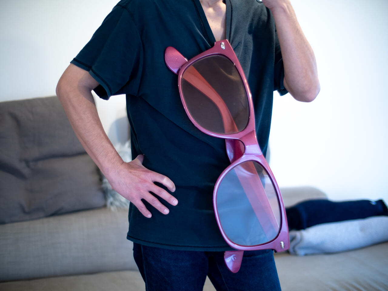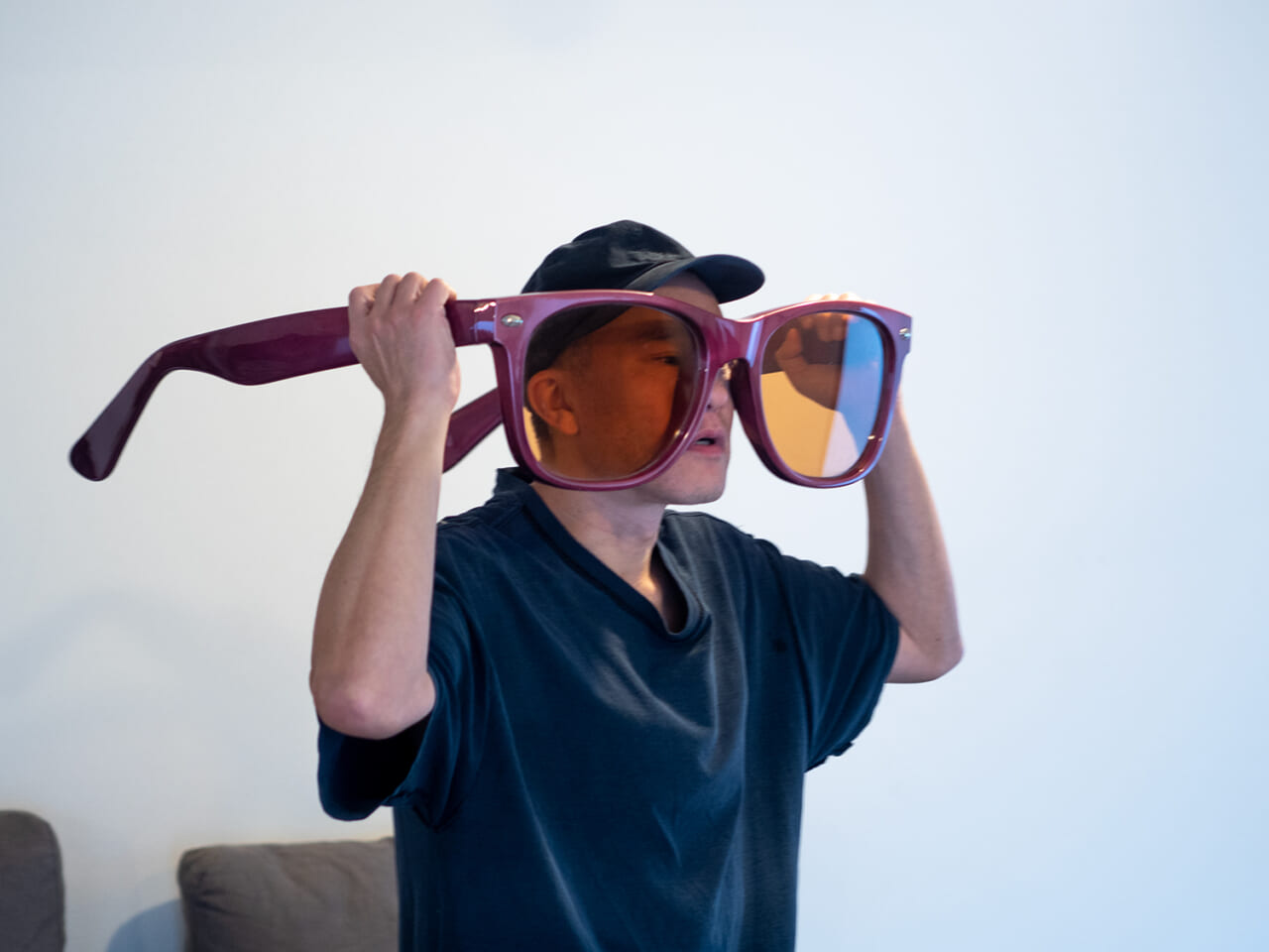 今日はお気に入りのアイテムを紹介します。サングラスです。5~6年前かな、ブラジルで見つけて衝動買いしました。色もいいでしょ。すごく気に入ってるんだけど、ひとつ問題があって。Tシャツにかけると、こんななっちゃうんですよ(笑)。ビロ~~~ン‥‥って、首が。つまり「めちゃくちゃデカい」んです、これ。あ、見ればわかる? サンパウロで展覧会をやったとき、あっちのアメ横みたいなエリアのみやげもの屋にフラッと入った瞬間「ああっ!」って思わず指差してました。「ほしい!」って。そのままレジに直進して「あのサングラス売り物ですか!?」って聞いたんですよ。そしたら何レアルだったか忘れたけど、日本円で「1万円くらいならいい」みたいな返事だったんで、すぐさま「買う!」って。レジ袋はいいですと自分から言いました。エコっていうより、入らないから(笑)。メガネスーパーに持ち込んだらどうなるだろうと思ってます。「ちょっと調子悪いんで、調整お願いします」とか言って。あるいは真夜中にこっそり鎌倉の大仏にかけたりとか。ある朝、大仏がサングラスかけてるんですよ? あのヘアスタイルで。絶対カッコいいと思います。あとは、まじめなオンライン会議に出たりとかね。「加賀美さん、今日のメガネ、ちょっと大きくないですか‥‥!?」「そう?」とか何とか、おもしろいじゃないですか。昔から「デッカいもの」を見ると、つい買っちゃうんです。アトリエには、デッカい「うまい棒」とかも転がってます。えっ、なんでデッカいものに惹かれるのかって? んー‥‥‥‥なんで、なんですかねえ。まず「笑っちゃう」っていうのは、ありますよね。デッカいだけで、おもしろいんです。東京ビッグサイトのあたりの地面に、デッカいノコギリが刺さってるじゃないですか。有名なポップアートのクレス・オルデンバーグの作品だけど、あれとかも相当おかしいですよ。冷静に考えたら。それっぽい色のバルーンで「デッカいウ○チ」のオブジェをつくったポール・マッカーシーには「先を越された」と思いました。逆に、明治時代の超絶技巧の職人さんとかが、えらい細かい木工細工の落花生みたいなのをつくるじゃないですか。あるいは、米粒に般若心経を書きましたみたいな人とか。ありがたみがすごいんですよ、ああいうのって。みんなから「細かいね!」「よくつくったね!」「超絶技巧だね!」なんて褒められて。ぼくだって「すごいな」とは思うんだけど、別に要らないんです。同じ落花生だったら、ヨギボーくらいデッカいほうが、ぼくは好き。なんでだろう。とにかく世の中、ちっちゃいものは褒められがちで、デッカいものは笑われがち。で、ぼくは、デッカいほうの味方です。