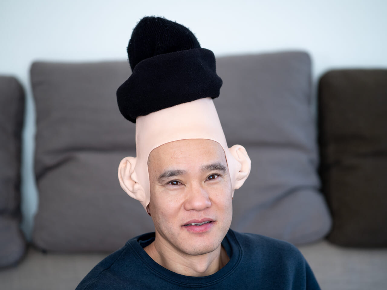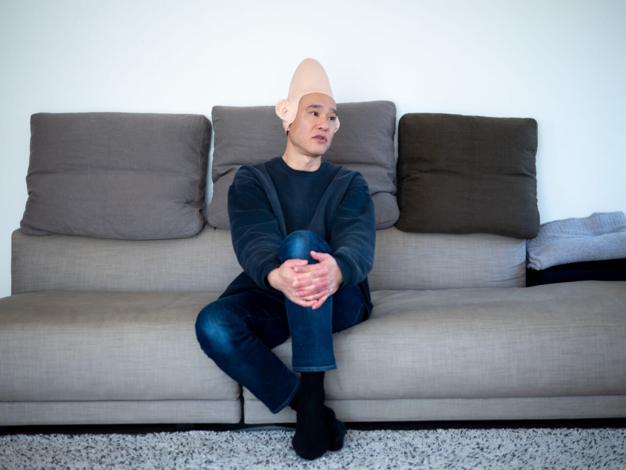 昔からラバーマスクが好きで、いろんなの持ってるんですけどね。こないだ、小学校のころの自分の写真を見たら、すでにかぶってたんですよ。うれしそうに。ゾンビのマスクか何かを、ウェ~なんつって。我ながらキャリア長げぇ‥‥と感心しました。おかげで、よくオススメされるんです。「加賀美さん、こういうの好きですよね?」って。Amazonさんに。これも、それでパッと見て、ウオッと思って、ポチッとクリックして買ったやつです。え、似合ってます? あ、そうですか。ありがとうございます。たしかにスルッと入りました。シンデレラフィットです。製造元がルービーズって、アメリカの有名な老舗コスチュームメーカーなんです。だからモノがいいんですよ。しっかりしてるし、かぶり心地もいい。とにかく、こういうの買うときって、本当に要るかどうかを自らに問いかけてはいけないんです。そんな問いがチラッとでも脳裏をかすめたら、何も買えなくなります。だって「本当に必要?」なんて聞かれたら、ぜんぶ要らないから(笑)。心が動いた瞬間に購入しなきゃダメ。必要かどうかじゃない。ほしいと思った気持ちが大事なんです。生活必需品の場合は「こっちのほうが使いやすそう、でもこっちのほうが安いんだよな」とか吟味して買うじゃないですか。ぼくが好きで買ってるものは「生活不用品」だし、そもそも比較対象がない。てっぺんのエッジもっと攻めてんのないかなとか、ないんで。人類は、そんなにコーンヘッズ各種つくってないんで。えっと、いつもどんな検索ワード入れてんのかって? 検索窓に? そうですね、「巨大」とか「ウ○チ」とか「非売品」とか「80年代」とか「カッパ」とか‥‥かな。それ、メルカリの人にも言われたことありますよ。「加賀美さんの検索ワードが気になる」って。そんなテーマのトークショーに呼んでもらったこともあります。ん、どういうときにかぶってんのか、ですか? いや、どういうとき‥‥これをかぶってファッション誌に出たことはあります。モデルとして。全ルック、この頭で。いいでしょ。なかなか評判もよかったんですよ。思えば、よくゆるしてくれたなあ。編集部の人。ふだん使いは、まだやったことないです。これかぶってお出かけとか、まだ。でも、もともと坊主なんで、今朝はちょっと寒いなー頭がって日とか、いいかもしれないですね。あったかいと思う。そうだ、この上に、さらにニット帽をかぶってみたらカッコいいかも。ほら、こんな感じで。エベレストとか南極とかだと手や足の指の先から凍るっていうじゃないですか。先っちょのほうから。この場合、頭頂部からやられると思うんですよ。だから凍傷っていうんですか、あれ防止って意味でも。