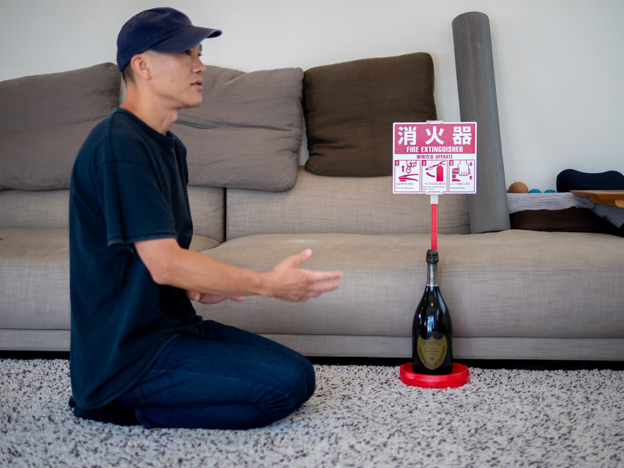 ※公共に設置された消火器は勝手に移動させてはいけません。加賀美さんも、あくまでご自宅のリビングで楽しんでいます。