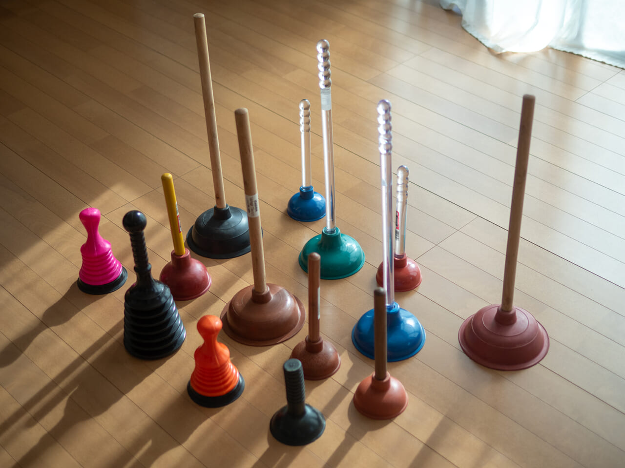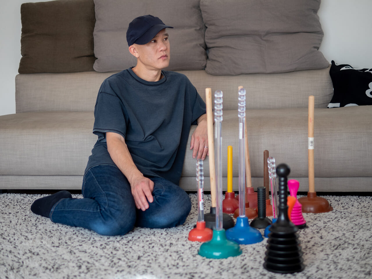 英語では「プランジャー」っていうんです、これ。日本じゃ「スッポン」でおなじみですけど、ようはトイレの管が詰まったら‥‥って説明する必要もないですね。みなさんご存知、一家に一本の必須アイテム。ただ日本のスッポンって、だいたい「黒」とか「グレー」じゃないですか。カップの部分はじめ。きっちり仕事をしてくれそうではあるものの、いまいち遊び心や華やかさに欠ける。その点、海外で見るスッポンは、こんなふうに楽しげなんです。色やカタチもさまざまで、つい集めたくなっちゃう。ここにあるのはスイス、ロンドン、ブラジル、サンフランシスコ‥‥だったかな。なかでも、この持ち手の短いタイプ、すごくないですか? ドキドキしちゃいますよね。仮にも詰まったトイレをスッポンスッポンする道具なわけです。なんでこの短さでいいと思ったんだろう。スッポンのたびに不吉な予感がするんだけど、気にしないんだ。カッコいい。10年前くらいから、海外へ行ったら金物屋さんみたいな店でスッポンを物色することにしてます。スーツケースに入れて持って帰ってくるんだけど、税関で「開けて」ってよく言われるタイプなんですよ、ぼく。税関の人に「お土産のぬいぐるみの中に、悪いクスリを入れて持ち込もうとする人もいるんで」とかって。なので、そのときに「なんでこの人、わざわざ海外でスッポン買ったんだろう?」と不審がられているかもしれません。「それも、こんなに」って。え、こう並べるとオブジェみたいですねって? そうでしょ。世界各国のスッポンが100個くらい集まったところを見てみたいですよね。個展でズラーッと展示してみようかな。ブロンズでスッポンつくってみようと思ってるんで、それと一緒に。あるいは、ひとつだけ「自宅用」の「現役」を混ぜとくとか。これだけは触ってもいいですよって(笑)。その意味で、スッポンがおもしろいなあと思うのは、一度でも本来の目的で使用した瞬間に悪魔みたいな扱いになるところ(笑)。デュシャンの《泉》じゃないけど、展示してれば「新しいアートですね」なんてありがたがるのに、使った瞬間に「あっちいけ!」でしょ。スッポンのペーソス感というか、人間の変わり身の早さというか。最後に、使用済みのスッポンは超強力な武器にもなると思います。とくに使用直後のスッポンならきれい好きの強盗くらいは撃退できそう。少なくとも一瞬、わるものどもを怯ませるくらいの破壊力を秘めてますよね。考えれば考えるほど、無限の可能性を感じるんですよ。スッポンって。