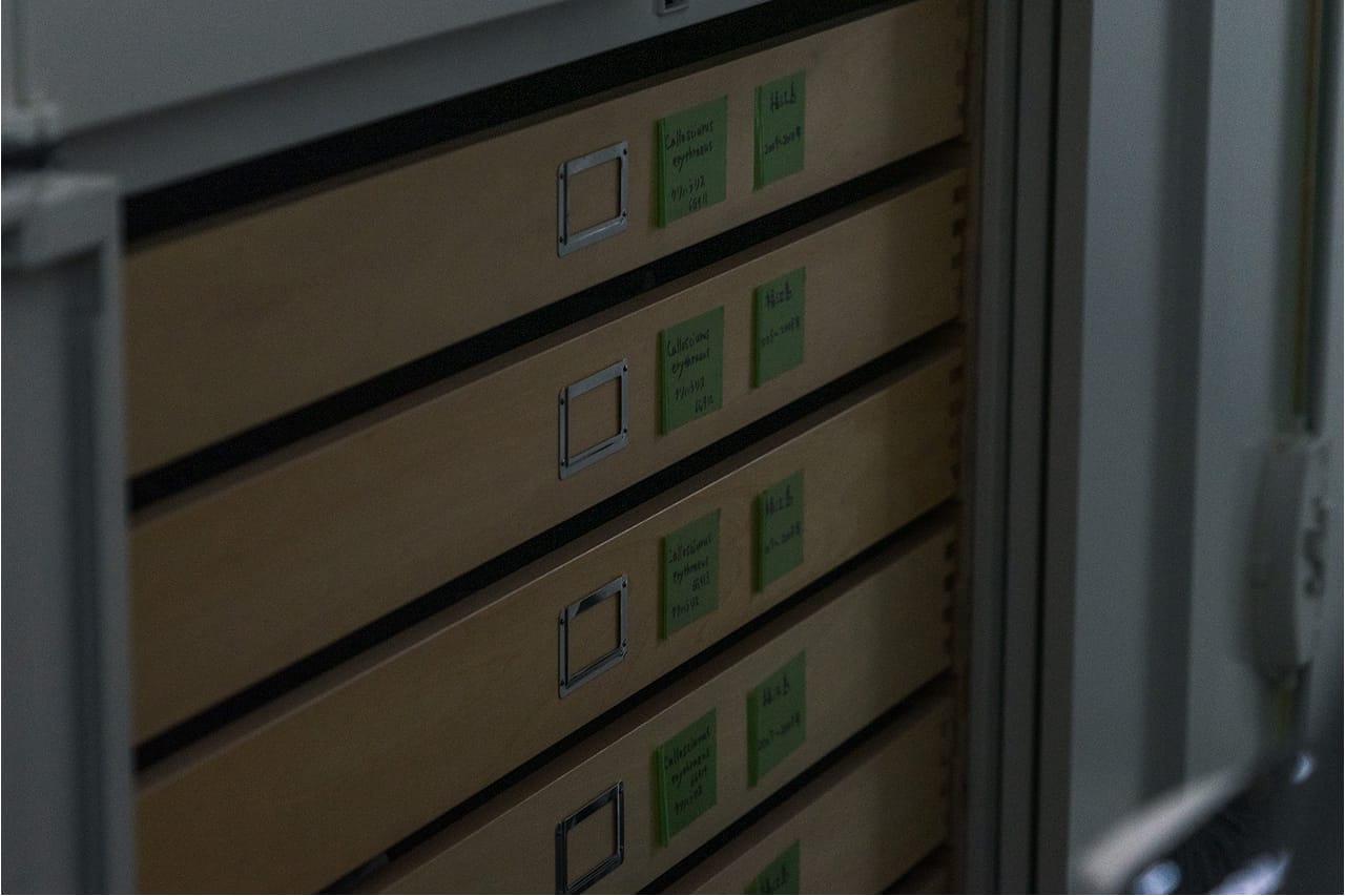 地域ごと、採集年ごとに分けられた小さな収納箱が、