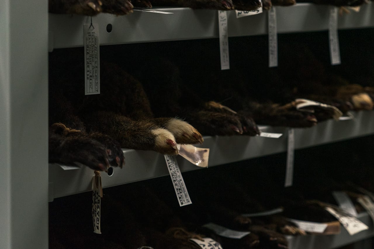 小型から中型の哺乳類の毛皮標本の棚に入ると、