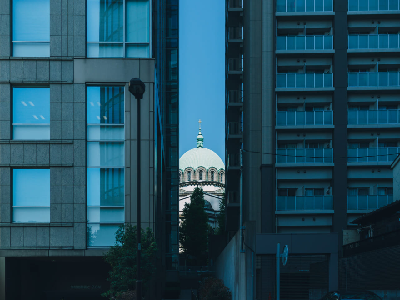 今日の写真は、ビル群の隙間から覗いたニコライ堂です。
