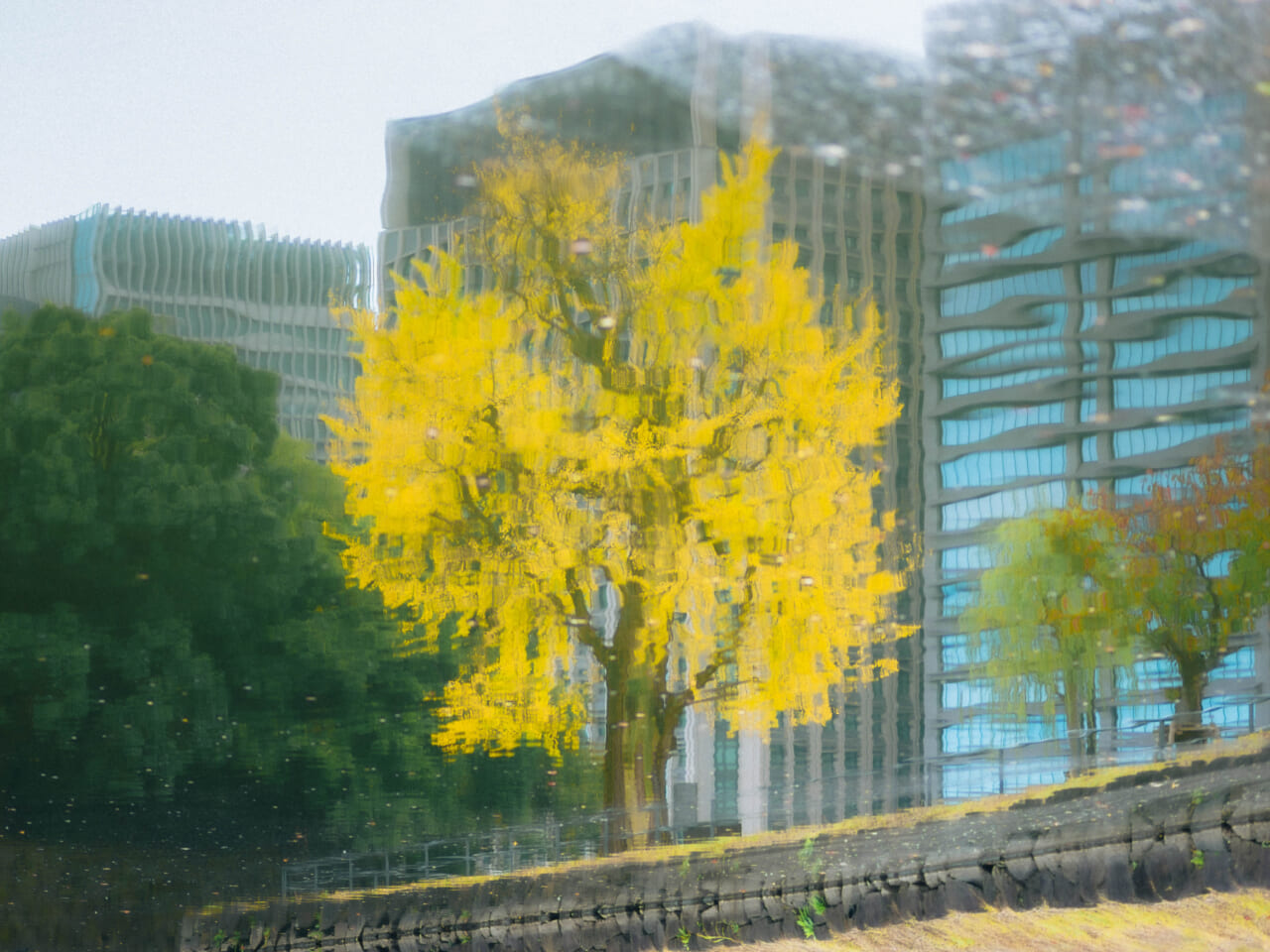 その水面に揺れるイチョウを眺めた。