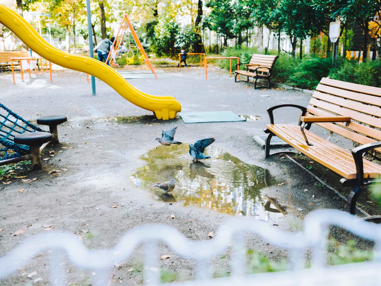 オスのいなくなった水たまりにいた二羽の鳩を、