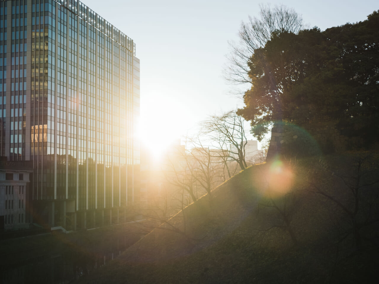 ビルとお堀の間から、