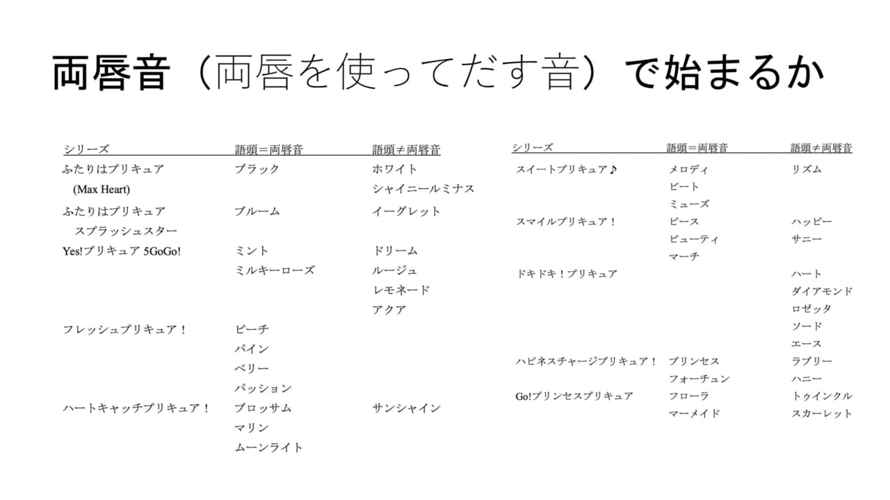 「プリキュアの名前は両唇音ではじまる確率が高い」