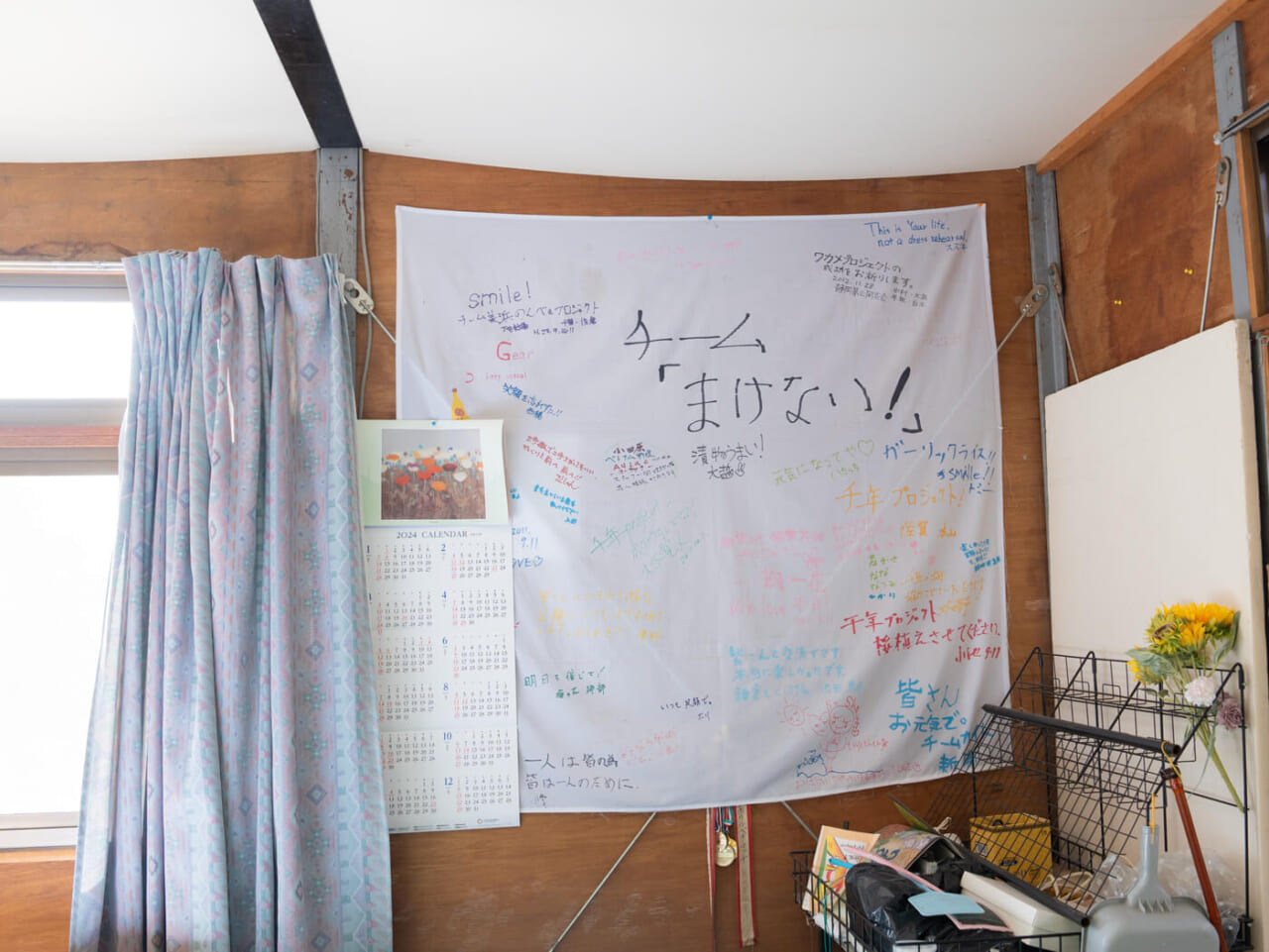 - メッセージが書かれた大きな旗が、