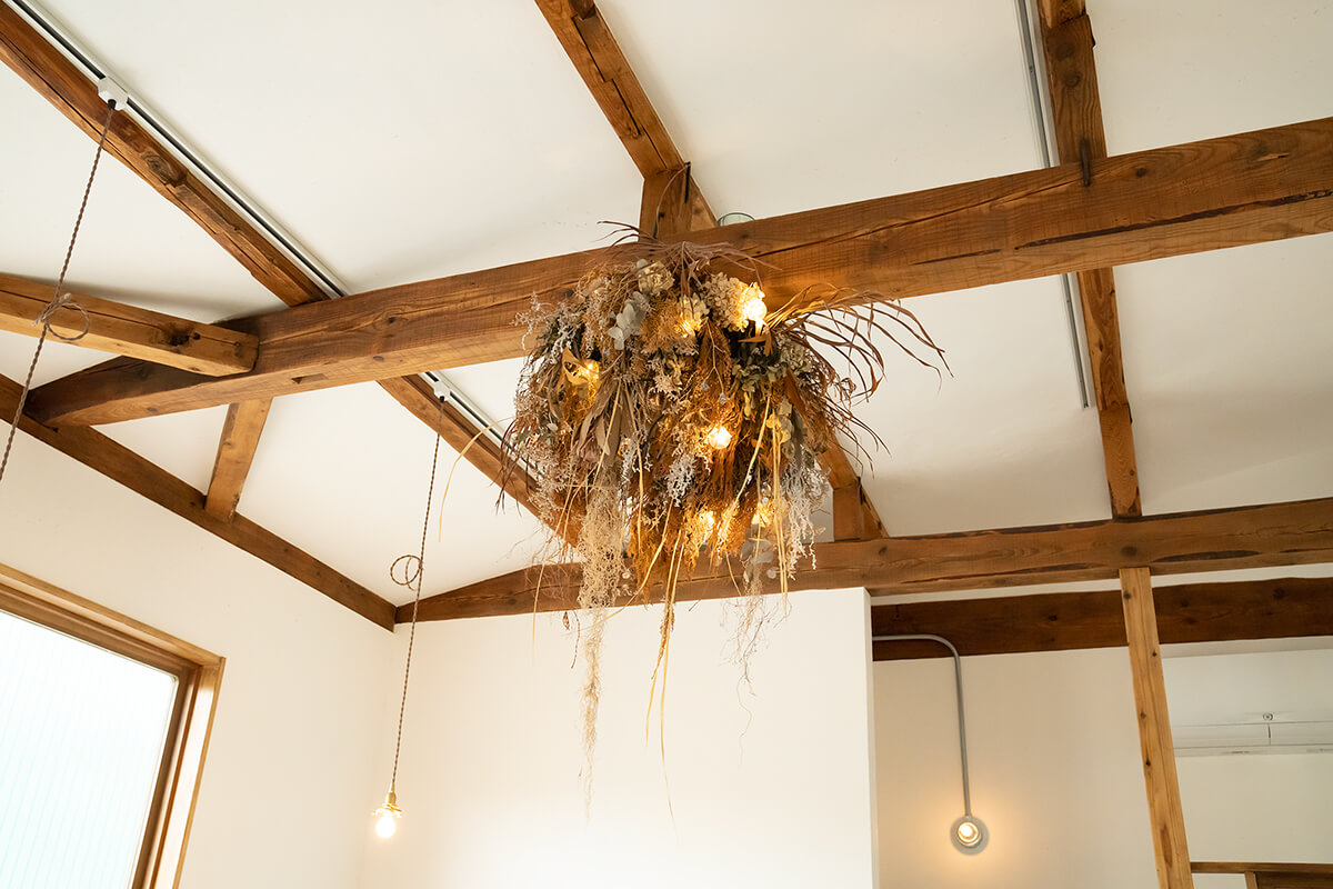 天井を抜いて梁を見せて、