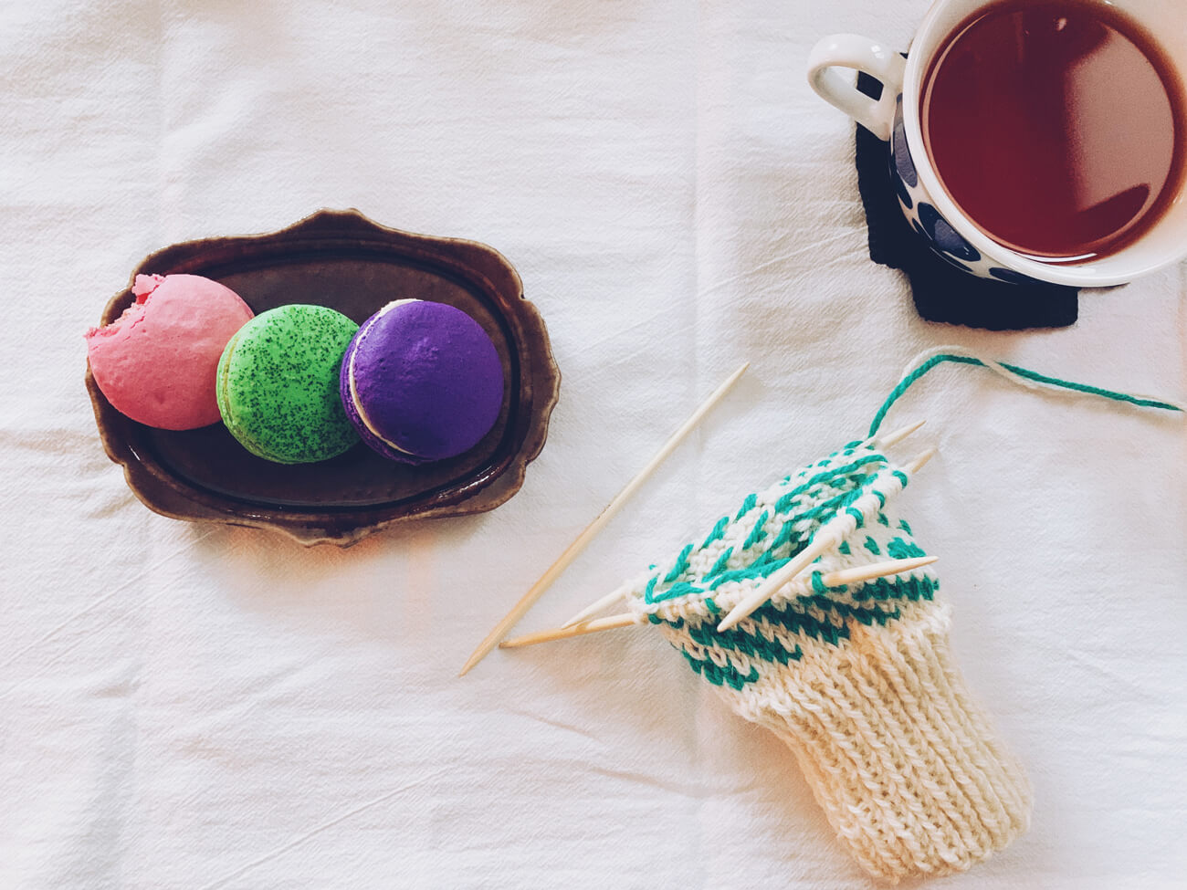 - カラフルなマカロンとローズヒップティーを