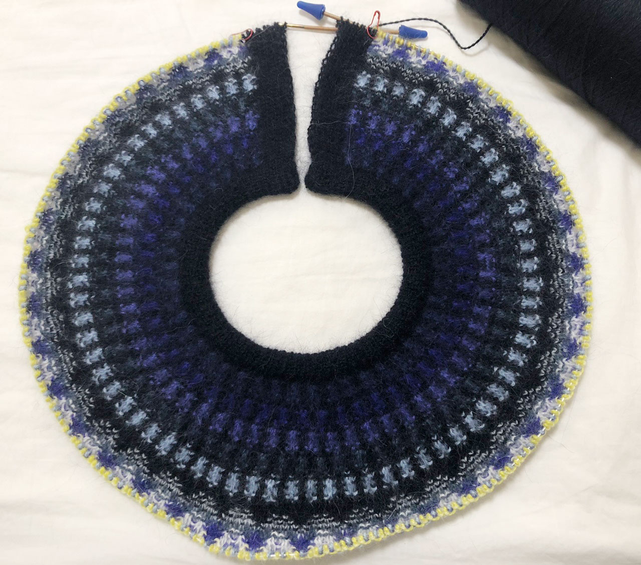 その後、日頃から慣れている輪針で編んでいます。