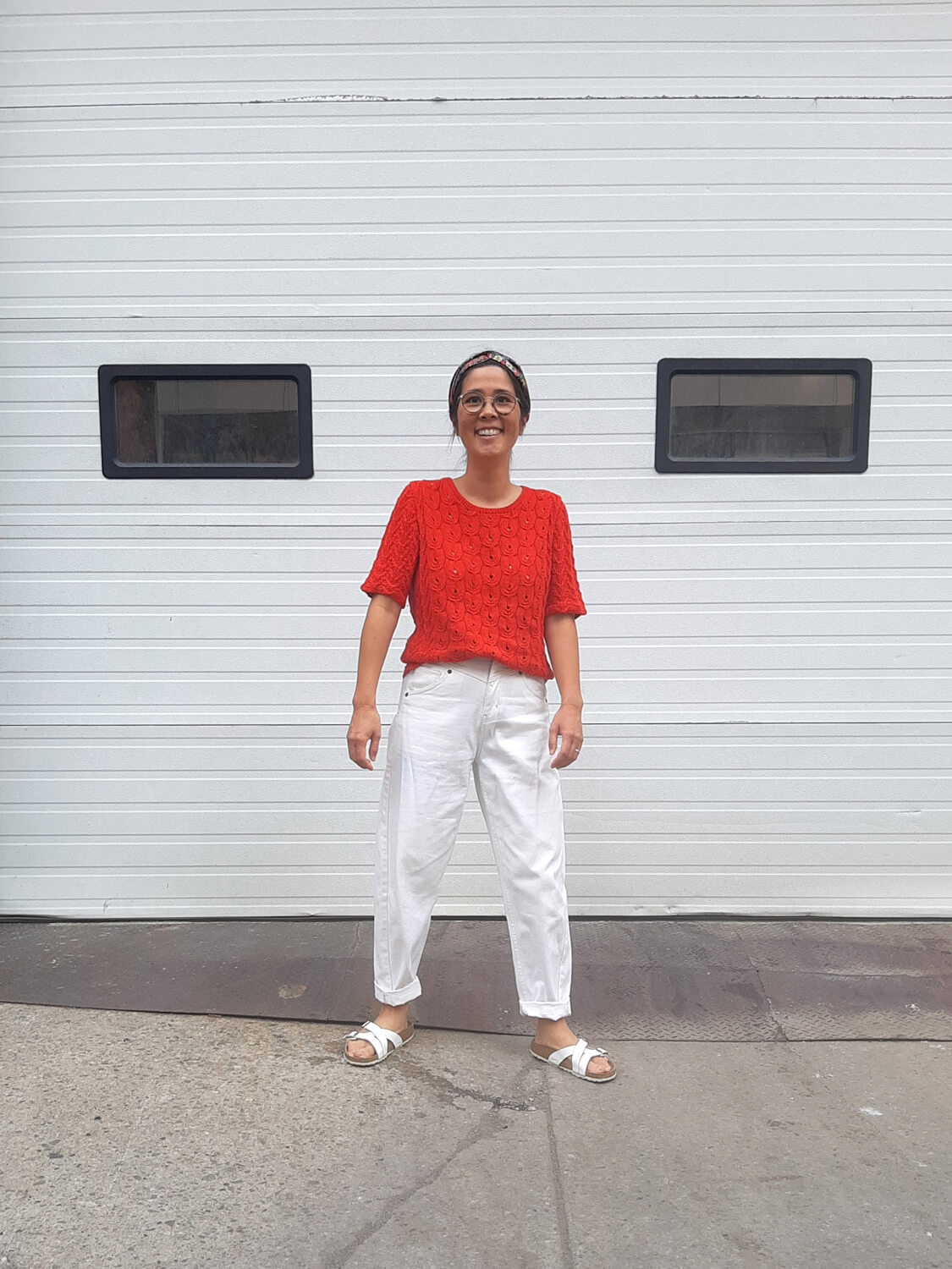 ゴールドチェーンのかぎ針編みバッグと一緒に着れば、
