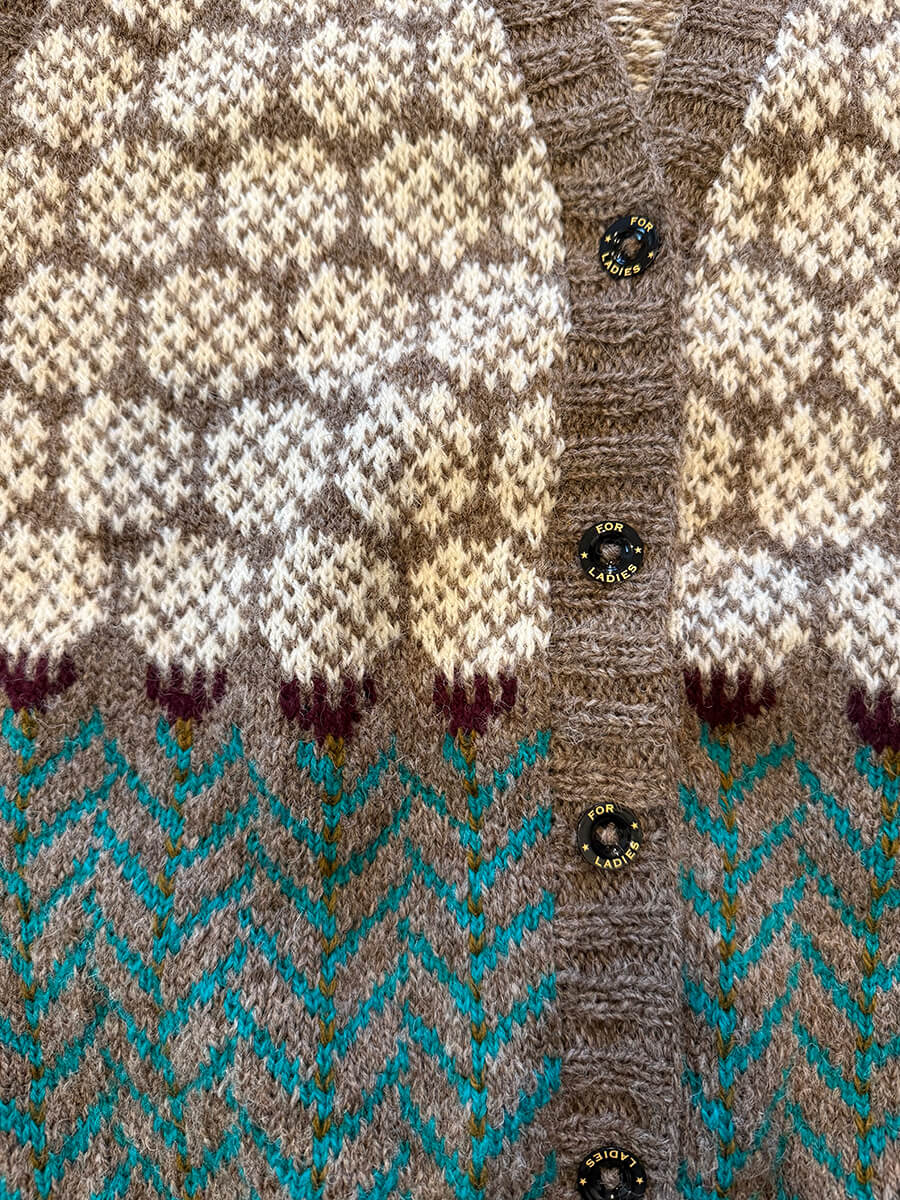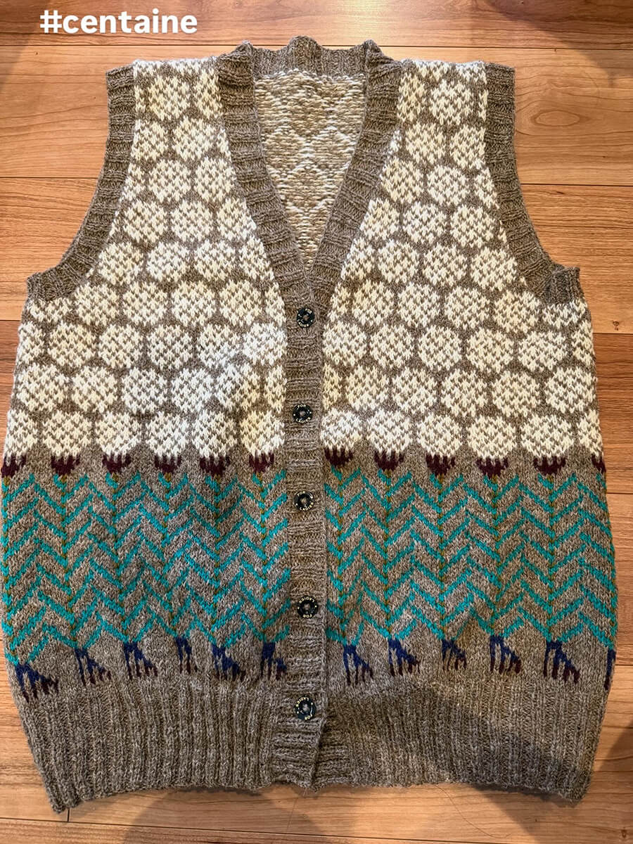 ベージュはキット付属ひと巻追加で間に合いました。袖ぐり襟ぐりボタン部分のゴム編みは、