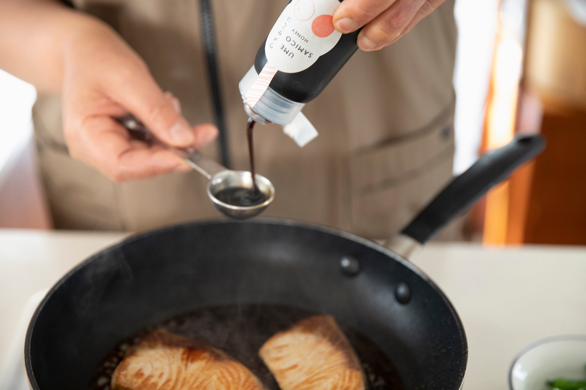 - 酒、しょう油、ウメサミコを加え、中火で加熱したまま、全体にたれを絡めます。