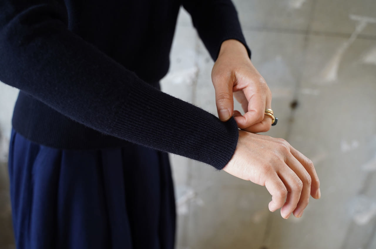 ファーストモデルは、クラシックなカシミヤセーター。