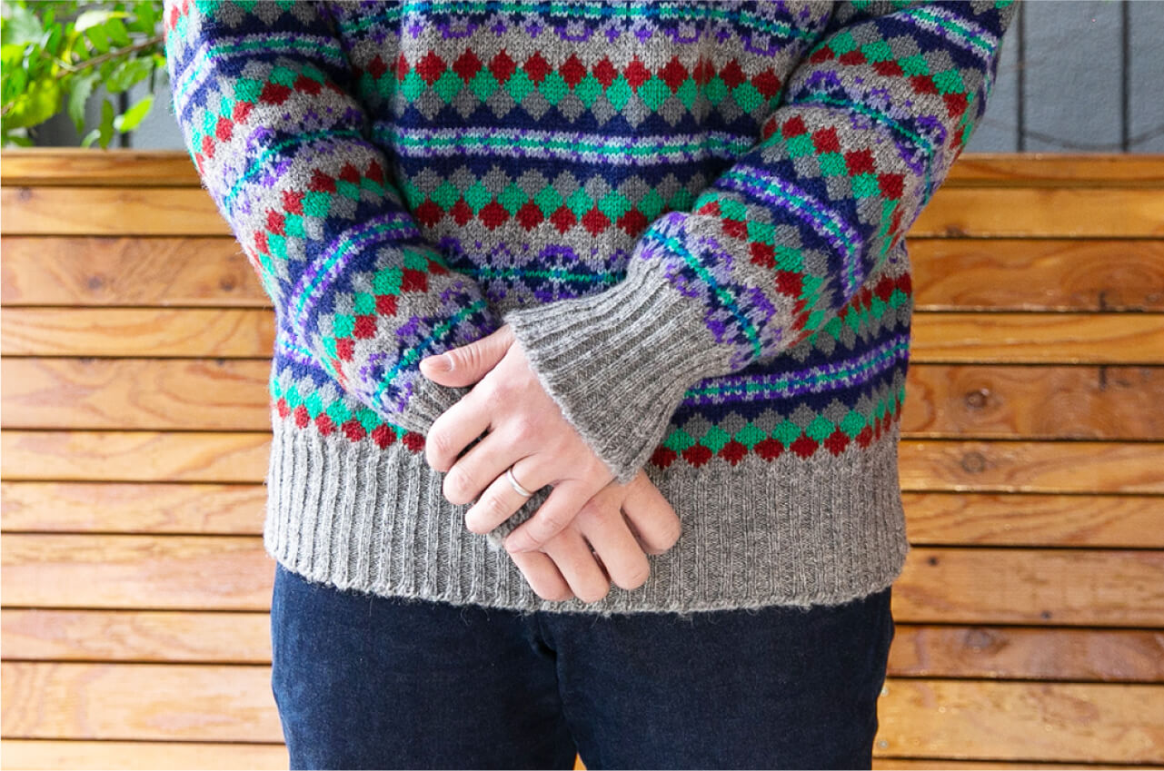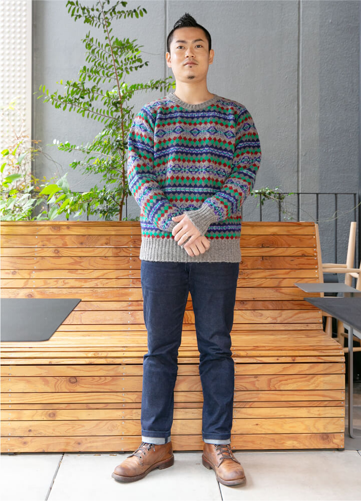 男性にしてはめずらしく、柄物好きですね。 - なので、Jamieson'sのニットは、