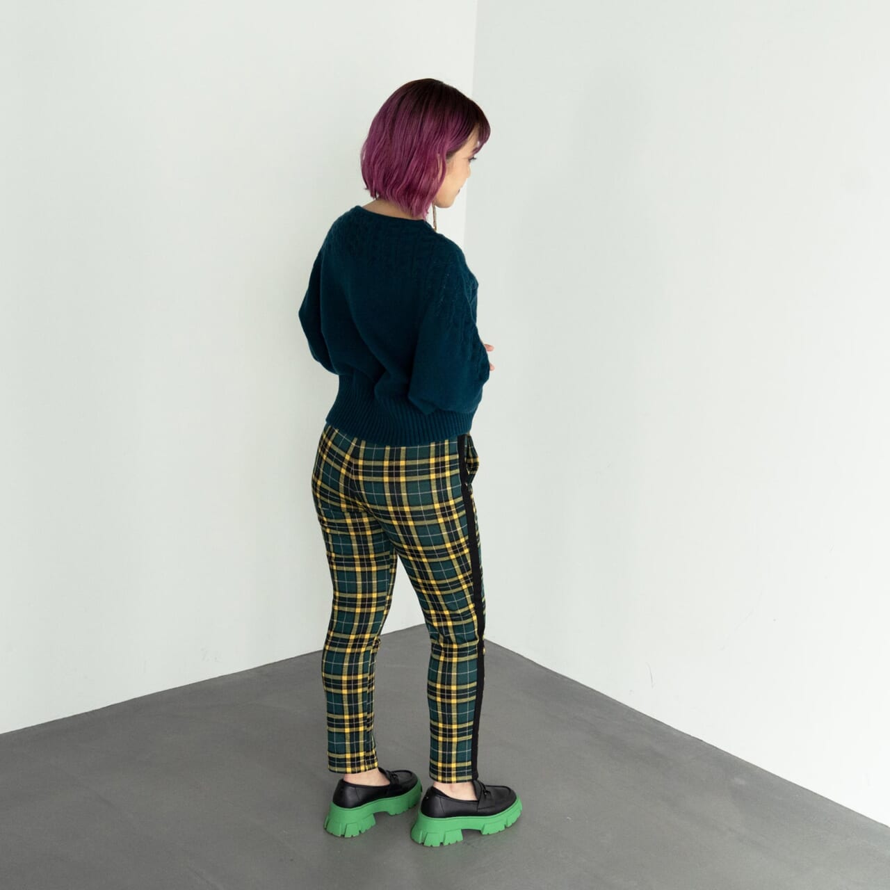 胸元が開いたトップスにハイウエストの柄パンツ、