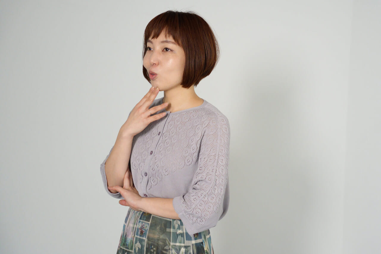 - 「私はカーディガンをうまく着られないんです(笑)。