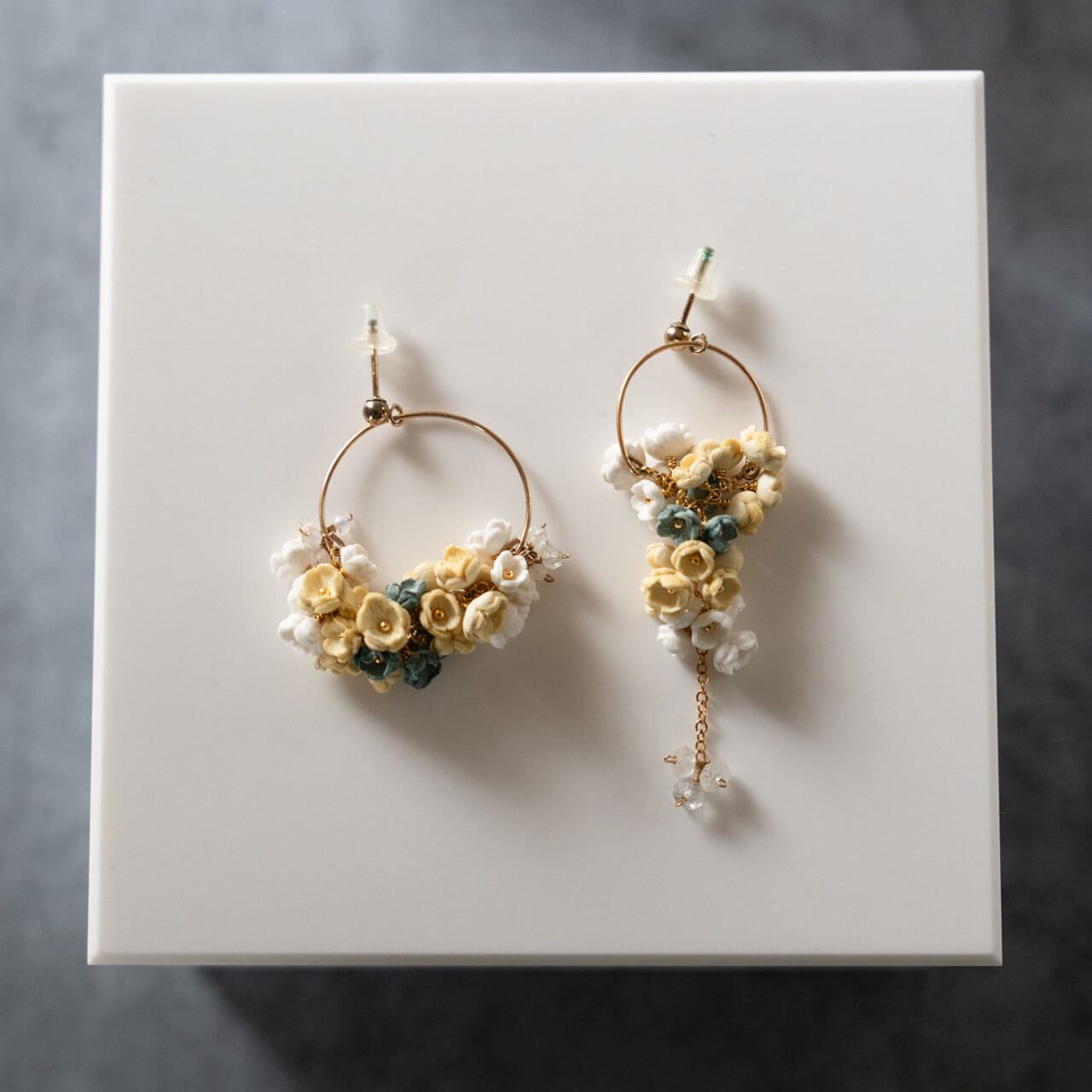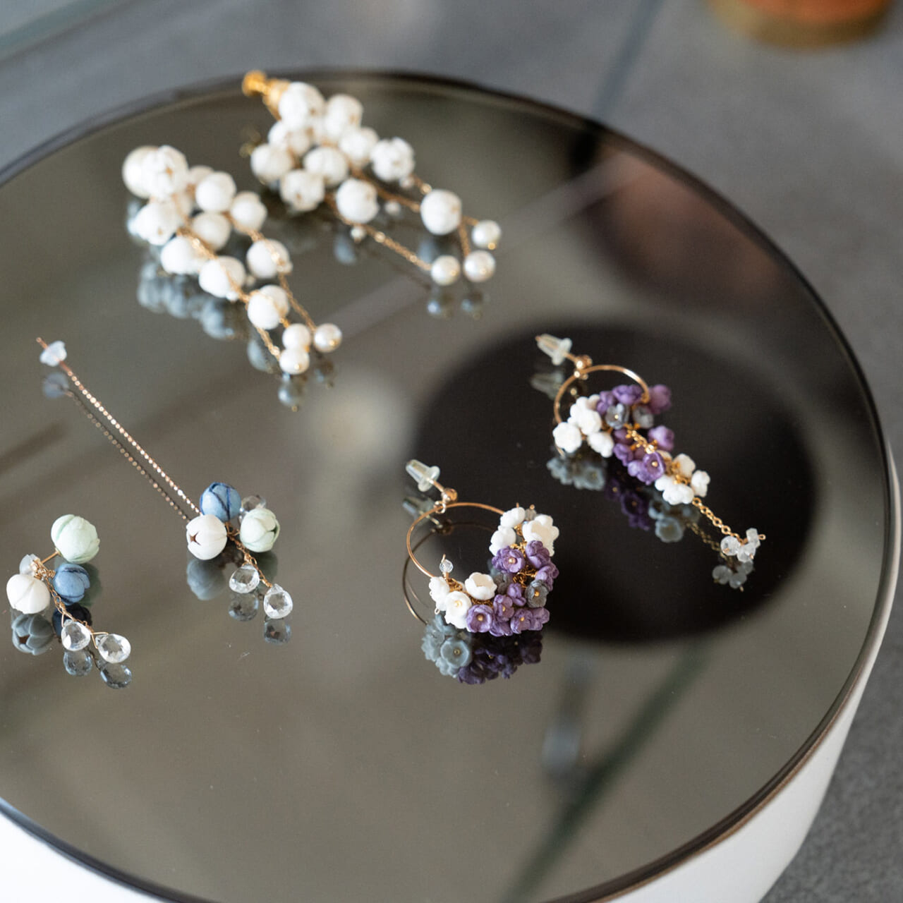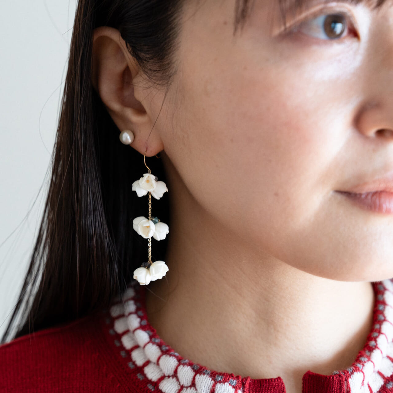 耳元もパールと丸みのあるモチーフがついた