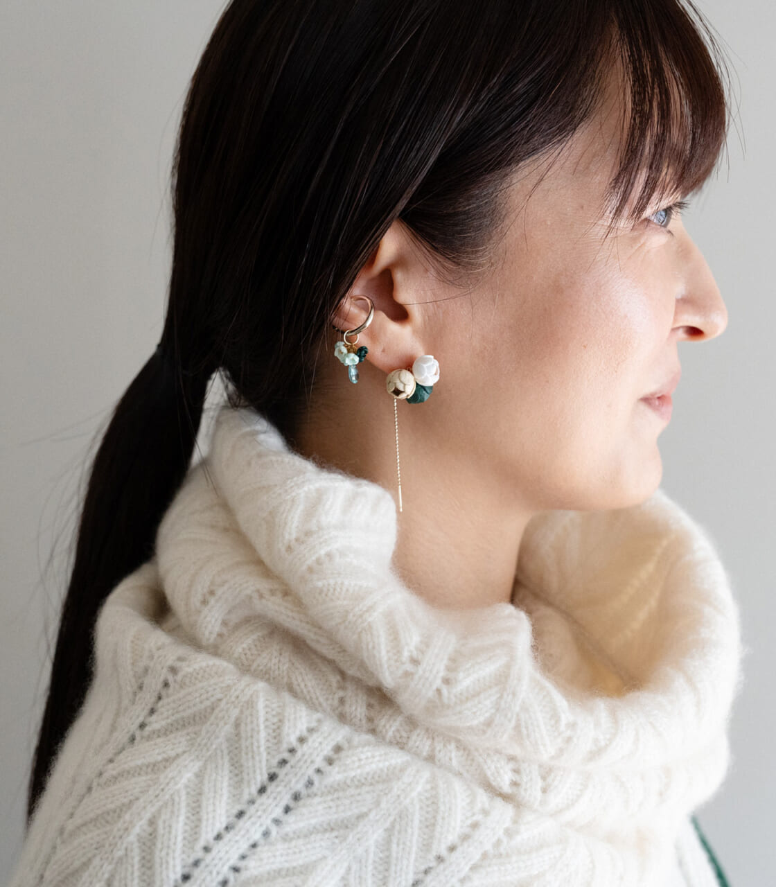 耳元のイヤーカフもアクセントに。