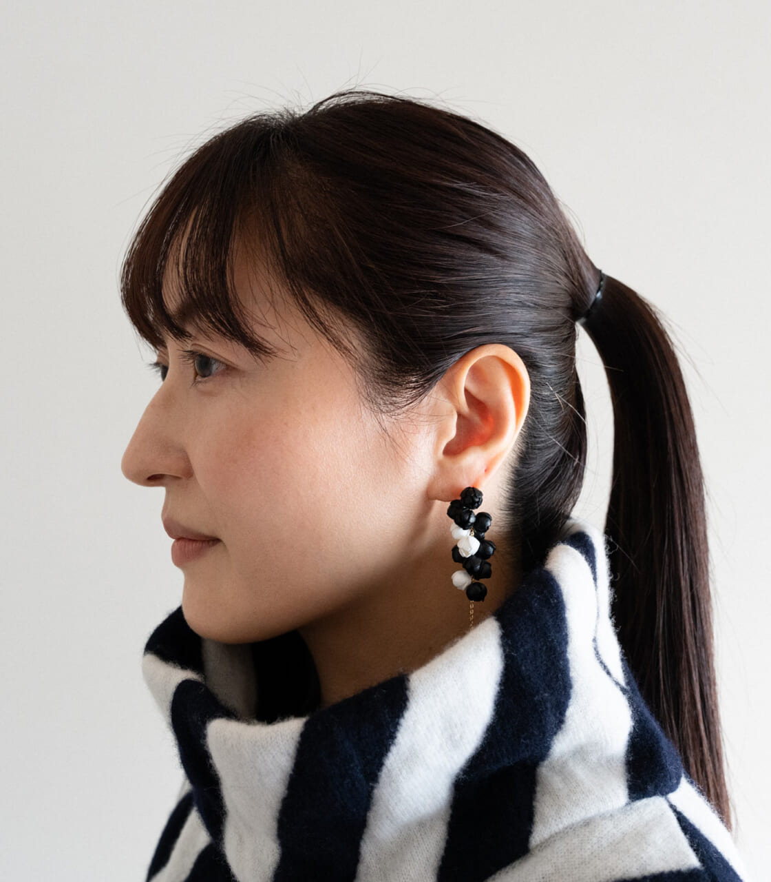 ピアスもモノトーンにし、