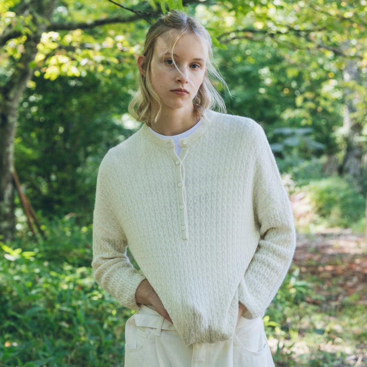 首元はヘンリーネック、ゆとりのある身幅で