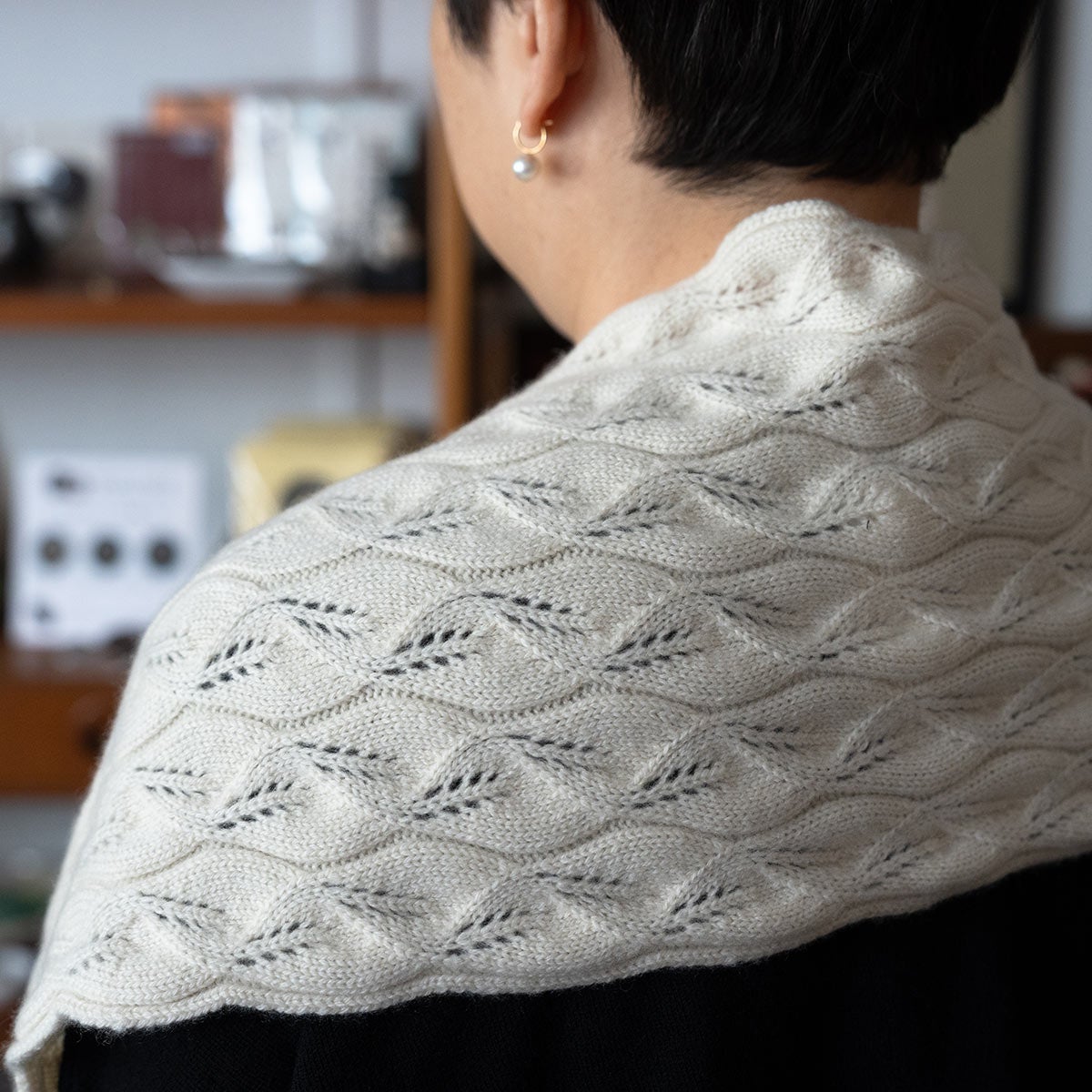 葉っぱのモチーフとデザインが目を引くマフラー。