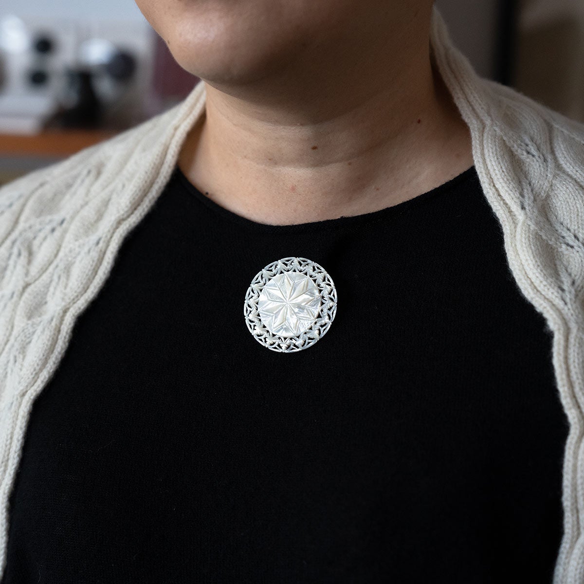 - 「胸元にはベツレヘムパールのブローチをつけています。