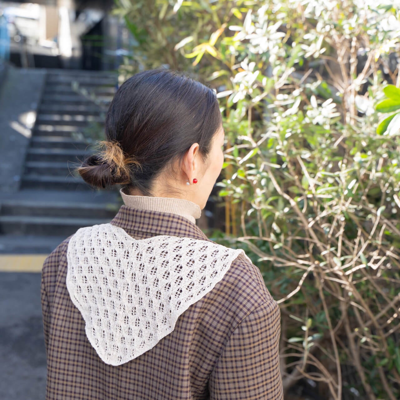 鳥の羽の重なりのようなレース柄のスカーフ。
